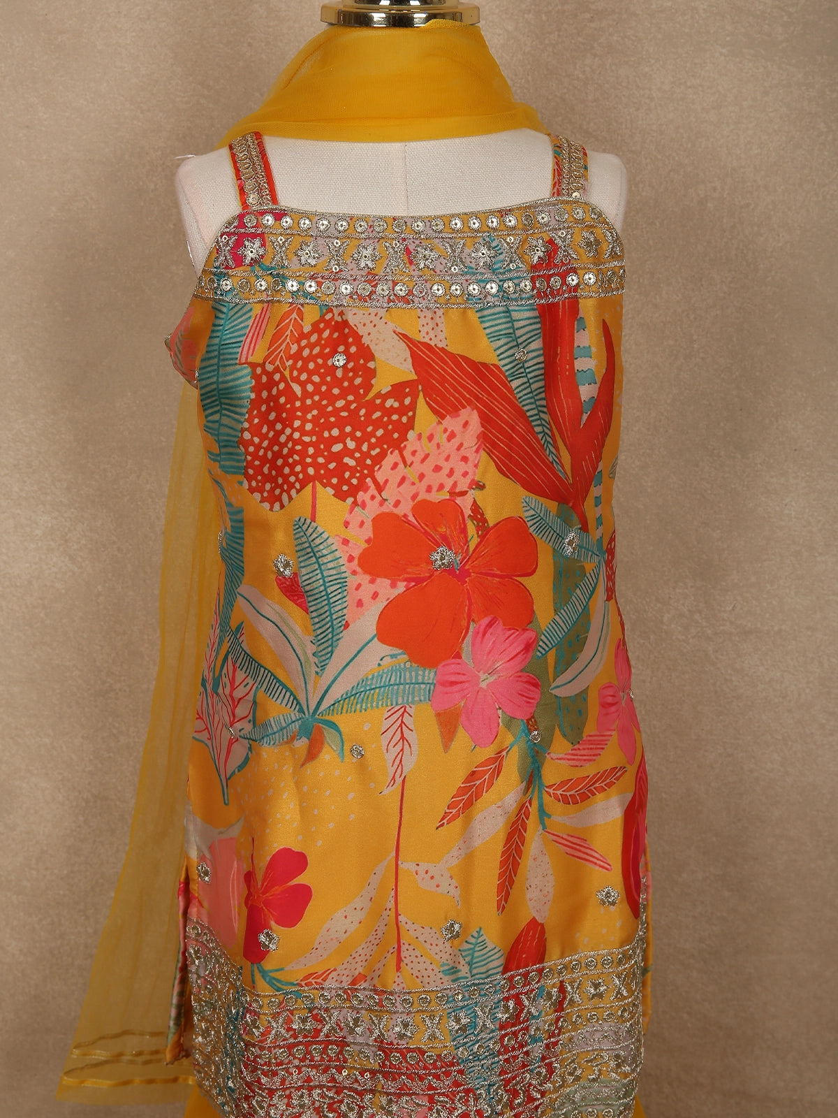 Bright, cheerful, and celebration-ready, this Mustard Yellow Floral Printed Georgette Kids Sharara Suit is a perfect festive pick for your little fashionista. The vibrant mustard base beautifully highlights the lively floral print in shades of coral red, pink, and leafy green, creating a fresh and playful look.