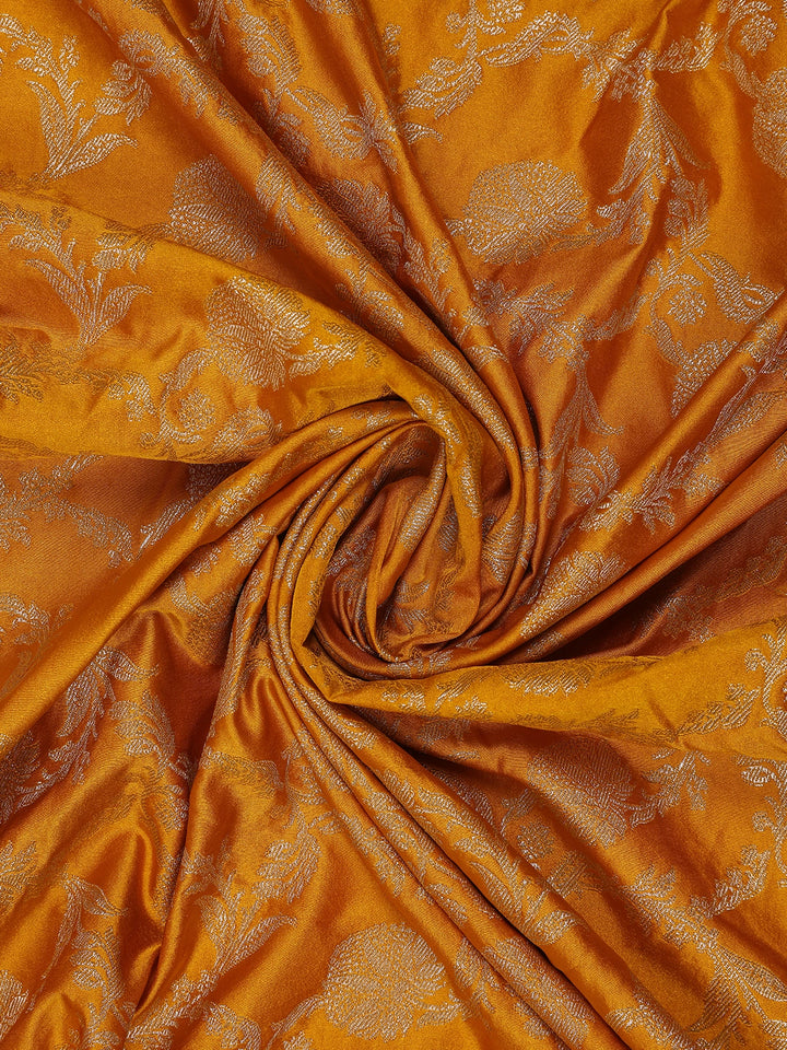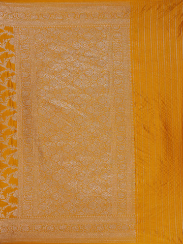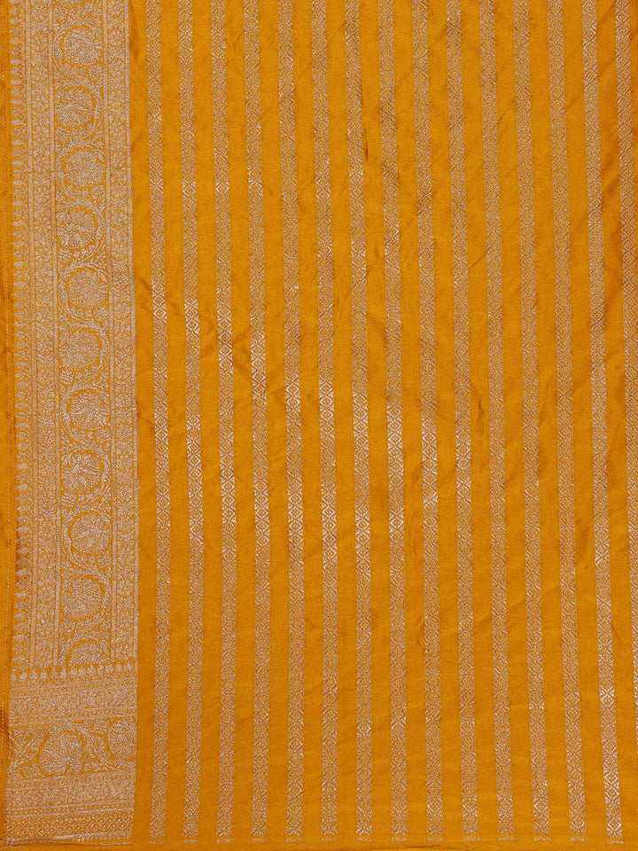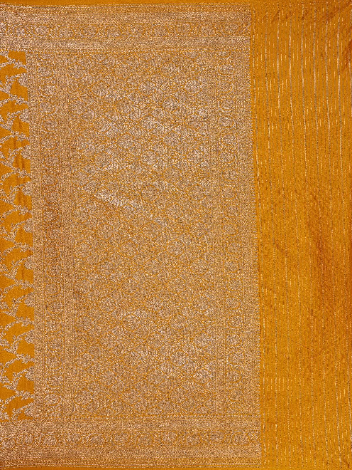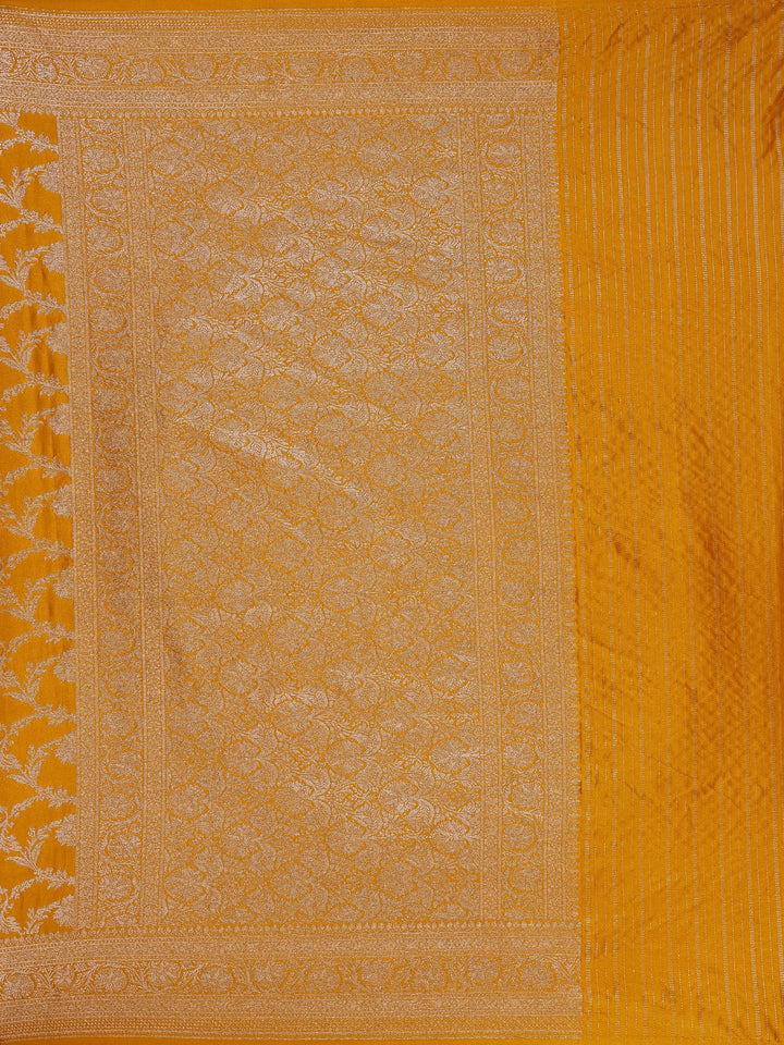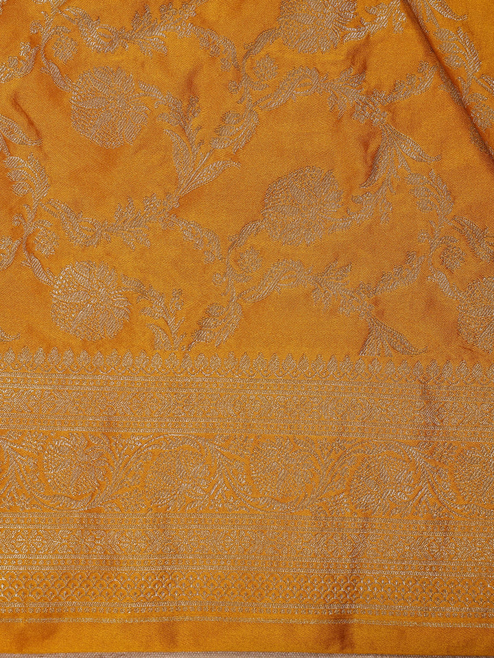 Bring home the warmth of tradition with this Mustard Yellow Floral Design Banarasi Saree, a stunning blend of heritage craftsmanship and radiant beauty. The mustard yellow body is adorned with delicate floral zari motifs, intricately woven to create a graceful pattern that glimmers softly with every fold.