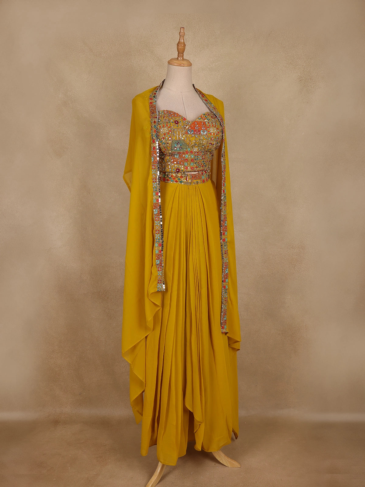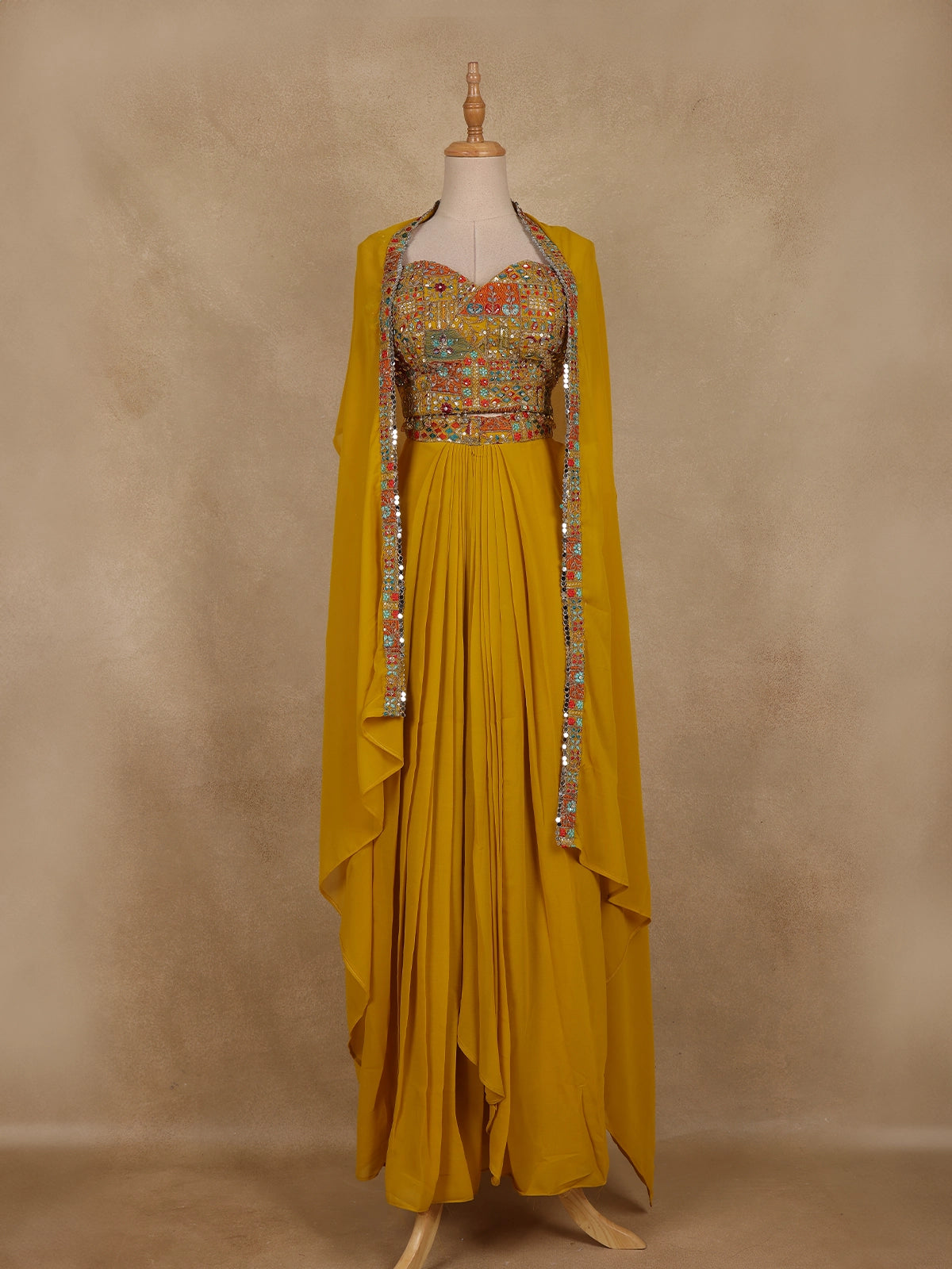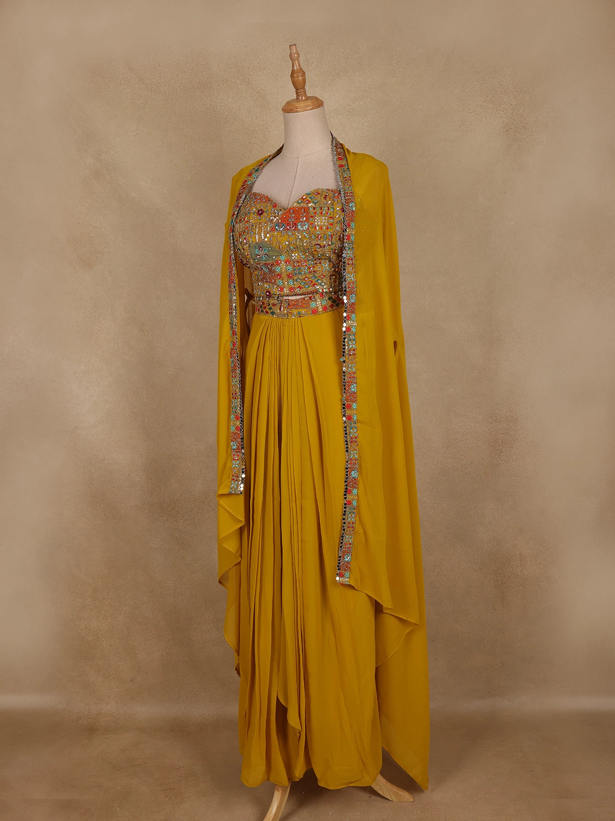 The flowing georgette skirt complements the embroidered top beautifully, offering a graceful silhouette that moves effortlessly with every step. A matching cape dupatta completes the look, adding a touch of contemporary drama and elegance. Ideal for festive gatherings, sangeet nights, or wedding celebrations, this outfit brings together tradition and trend in perfect harmony.