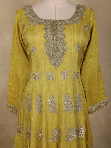 Elevate your festive wardrobe with this mustard yellow tissue silk palazzo suit, designed to exude elegance with a contemporary ethnic charm. The kurta is crafted from luxurious tissue silk and adorned with intricate floral embroidery and subtle sequin highlights, creating a graceful shimmer that enhances its festive appeal.