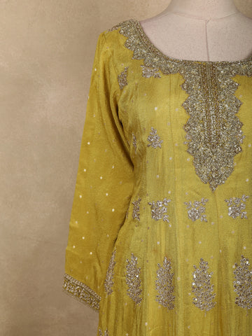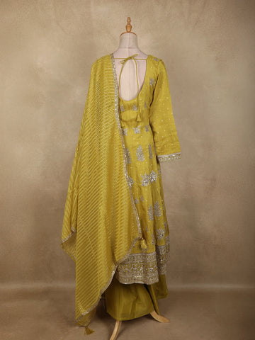 Mustard Yellow Floral Embroidered Tissue Silk Palazzo Suit with Striped Dupatta