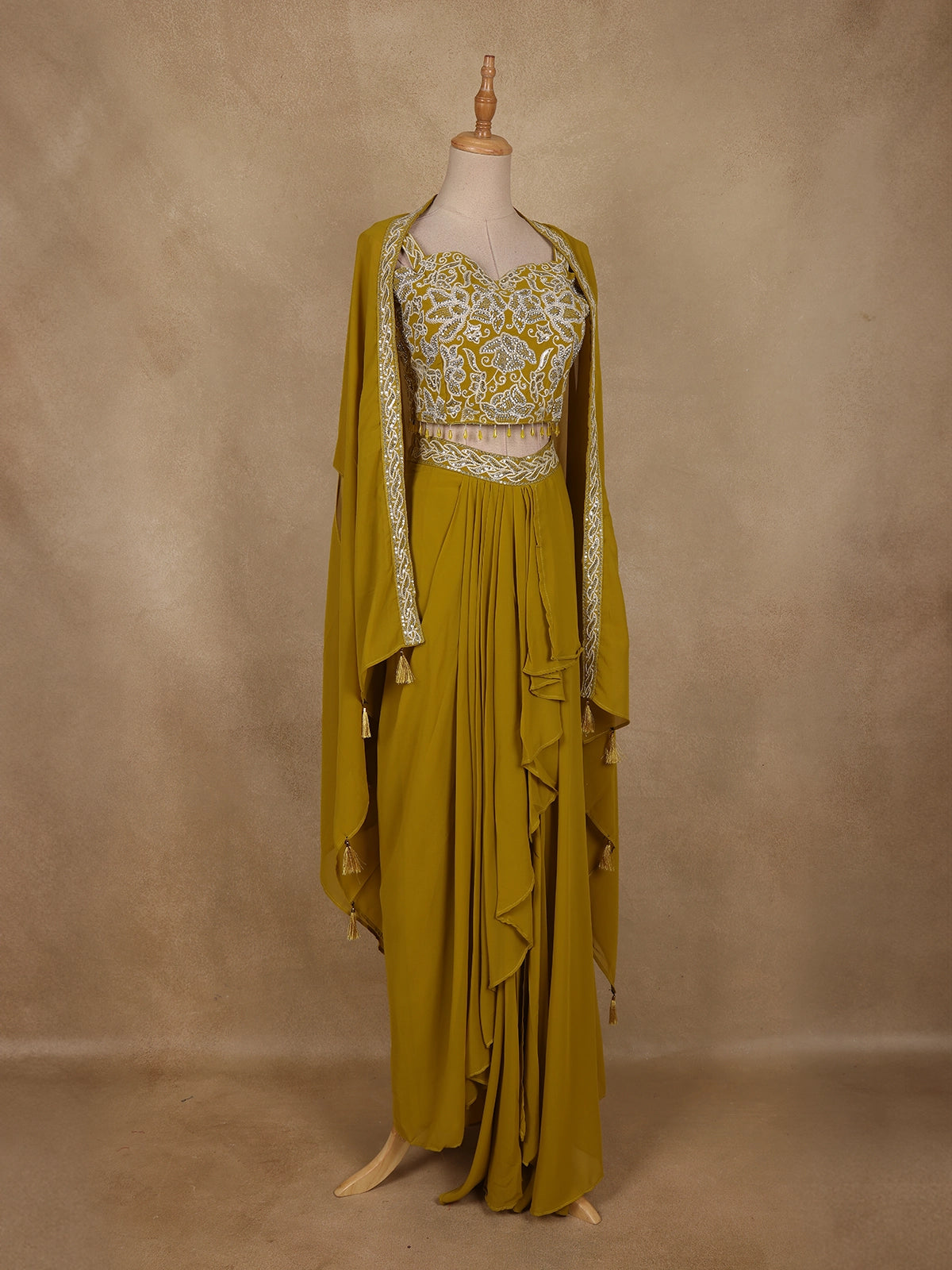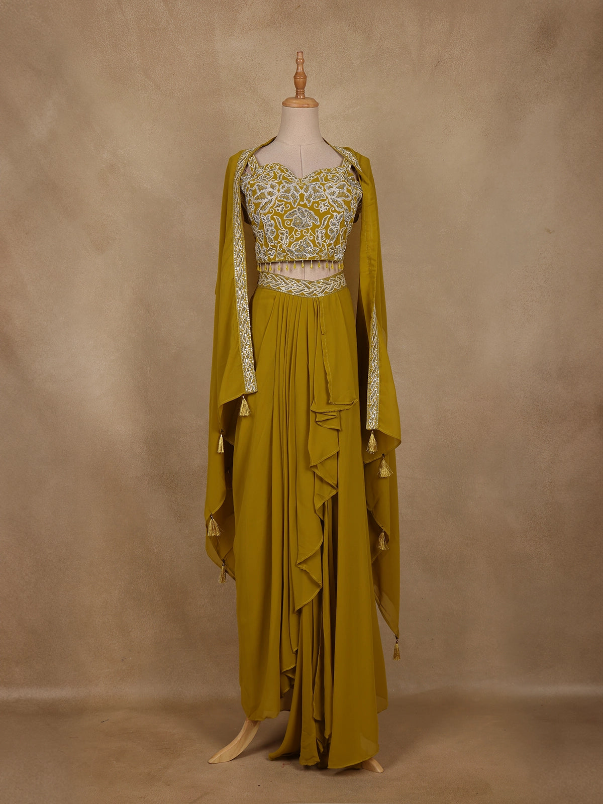 The draped skirt falls gracefully with soft pleats, enhanced by an embroidered waistband that complements the top’s design. A flowy cape with embellished borders and tassel accents completes the outfit, offering a regal layered look perfect for festive evenings, weddings, or elegant parties.
