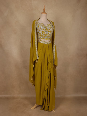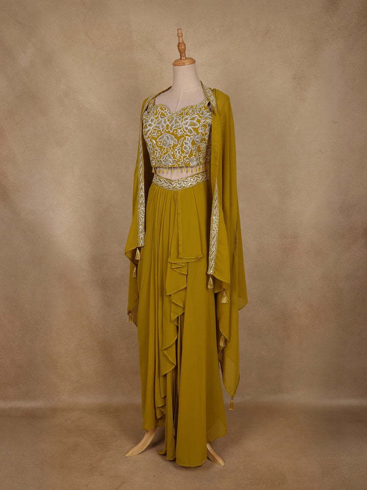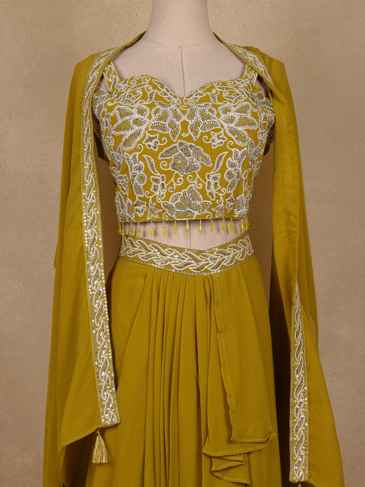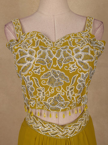 Step into the spotlight with this mustard yellow georgette ensemble that blends traditional artistry with a modern silhouette. The crop top features intricate floral embroidery enriched with shimmering silver sequins, forming a radiant pattern over a rich mustard base. Its sweetheart neckline and sleeveless design add a touch of contemporary charm, while delicate bead tassels along the hem lend a playful finish.