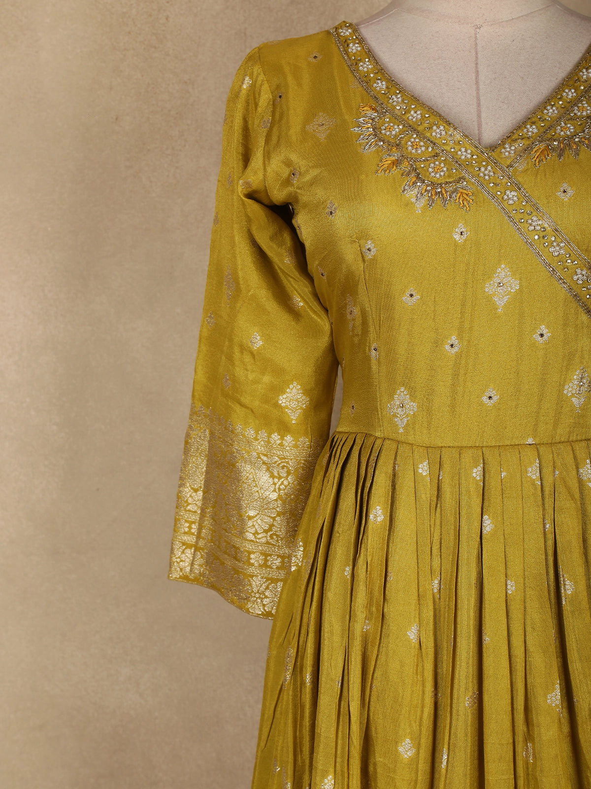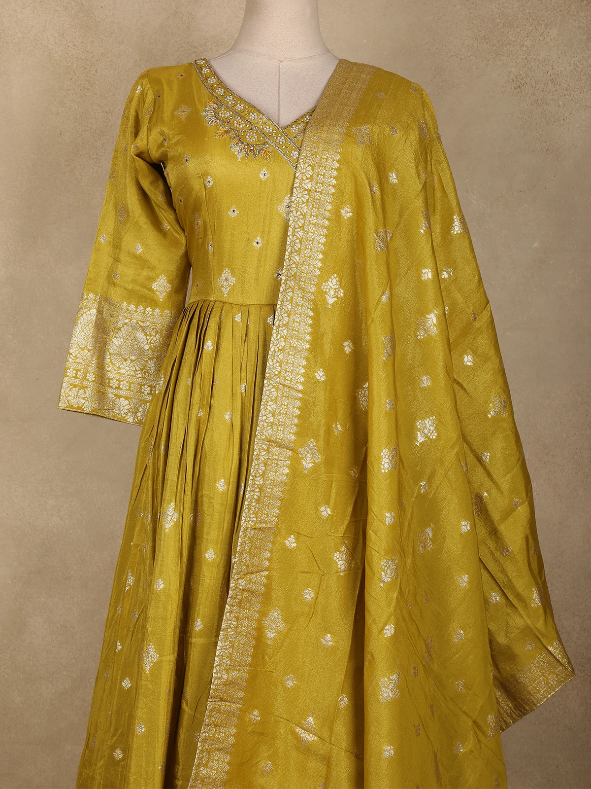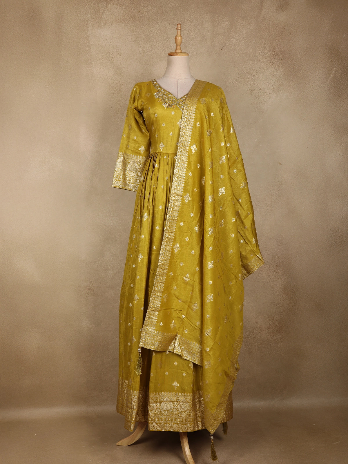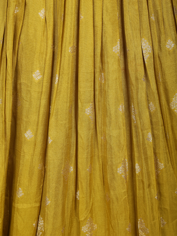 Radiating timeless elegance and festive grandeur, this Mustard Yellow Floral Gold Zari Butta Woven Design Tissue Banarasi Gown with Dupatta is a perfect blend of traditional craftsmanship and graceful silhouette. Crafted from luxurious tissue Banarasi fabric, the gown features an all-over gold zari floral butta weave that adds a rich, luminous charm to the ensemble.