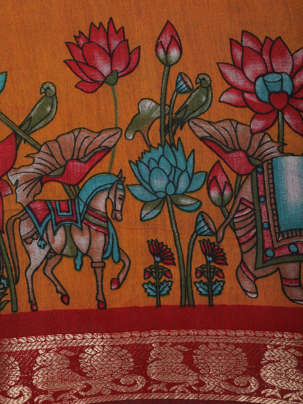 This saree brings together the grace of traditional hand-drawn Kalamkari artistry with the light, airy texture of Chanderi cotton. Set against a warm mustard yellow base, the saree features a captivating tableau of lotus blooms, parrots, and intricately embellished horse and elephant motifs, adding a touch of cultural storytelling to your drape. The rich maroon contrast border is finely woven with zari detailing, giving it an elevated festive finish that glows beautifully in natural and evening light.