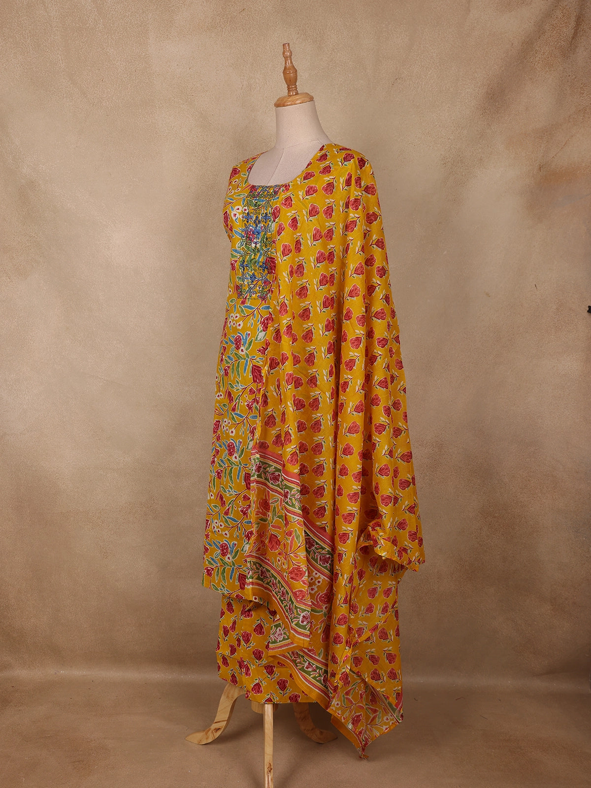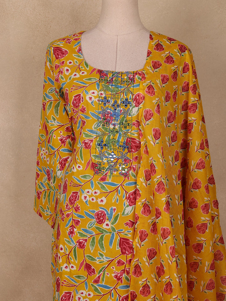Mustard Yellow Floral Printed Cotton Salwar Suit with Dupatta
