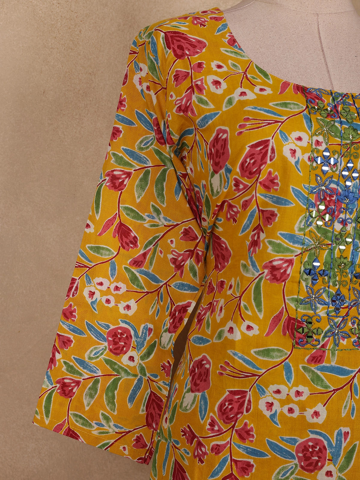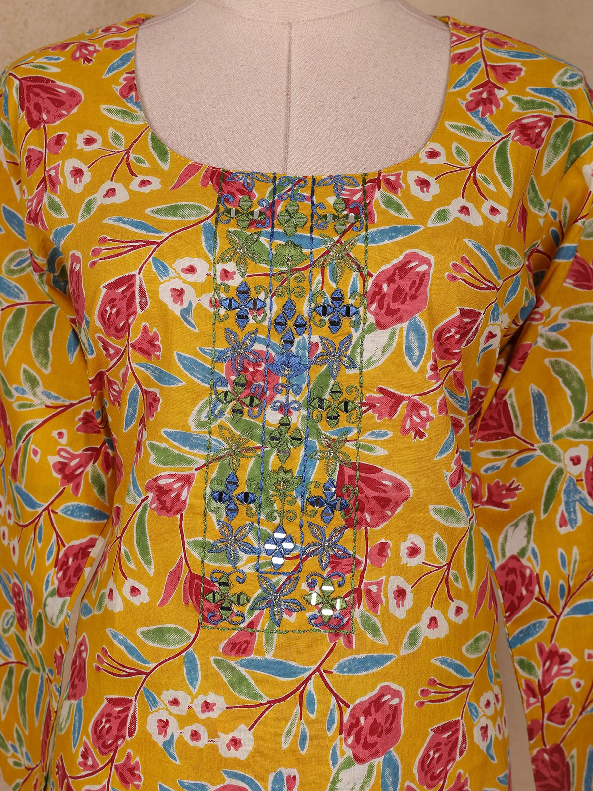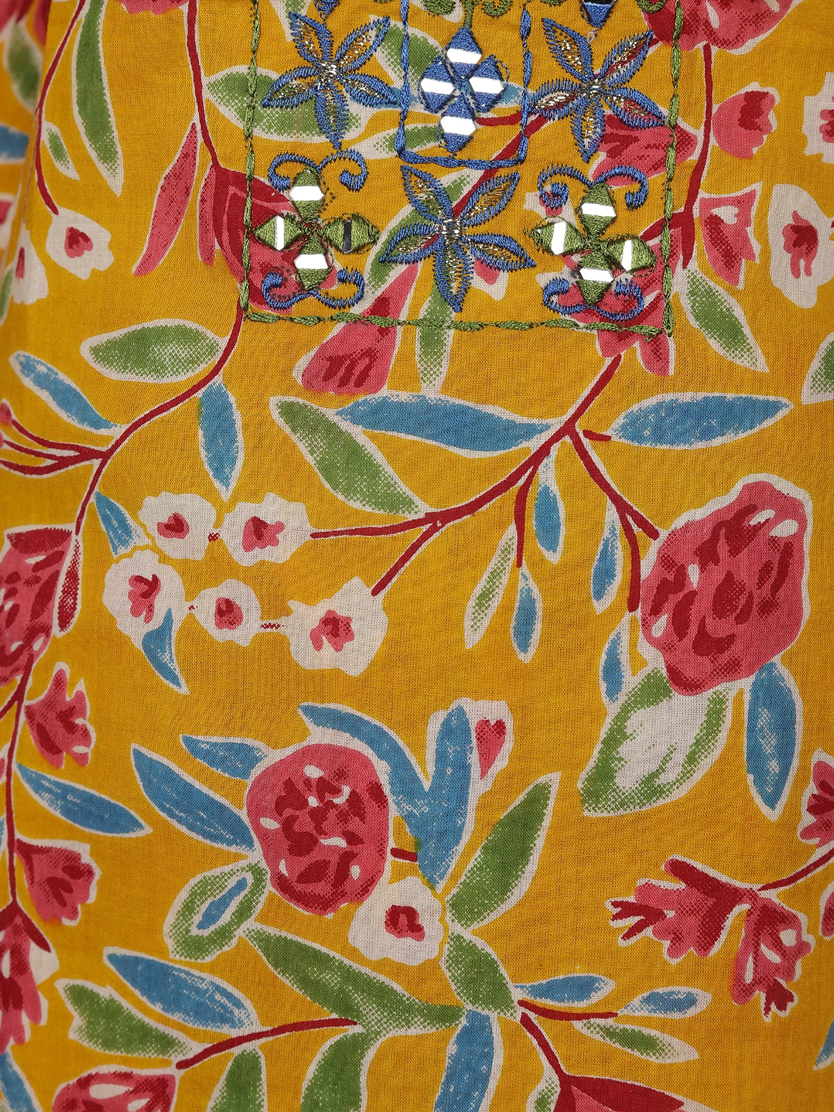 Bring a burst of sunshine to your wardrobe with this mustard yellow floral printed cotton salwar suit. The kurta features an eye-catching multicolor floral pattern in shades of red, green, and blue, beautifully accentuated with delicate mirror embroidery and threadwork along the neckline. The square neck and three-quarter sleeves add a chic touch, blending modern appeal with ethnic vibrance.