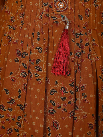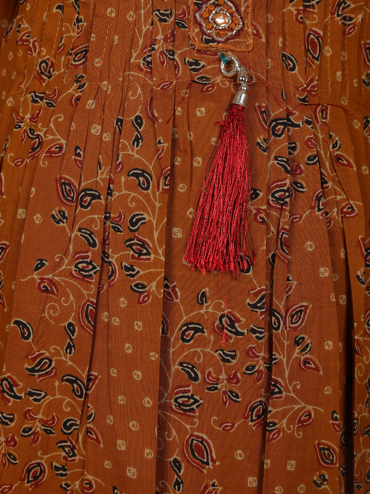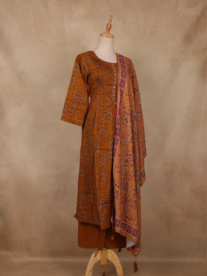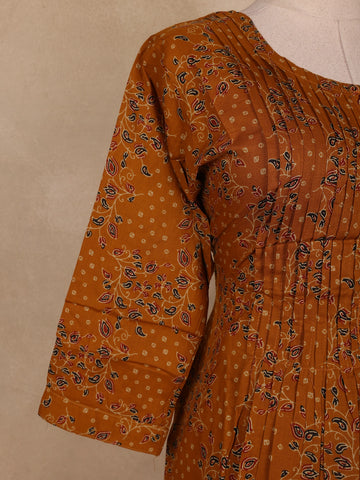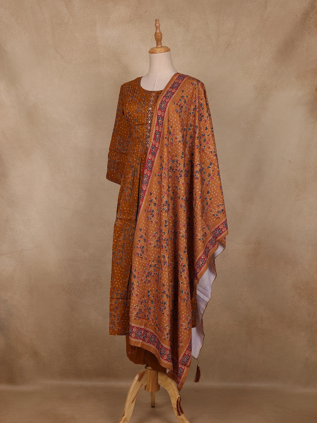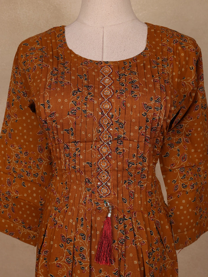 Exuding earthy elegance, this Mustard Brown cotton salwar suit showcases a timeless floral print highlighted with delicate thread and sequin work along the front yoke. The pleated panel detailing adds structure and charm, while a touch of mirror embroidery and a contrast maroon tassel accent complete the neckline with finesse. Designed with a round neck and three-quarter sleeves, the outfit combines traditional aesthetics with everyday comfort.