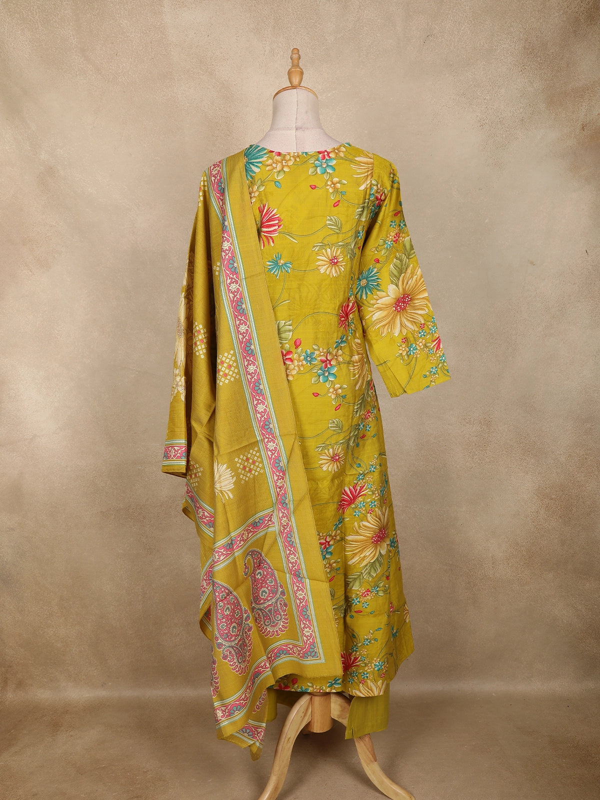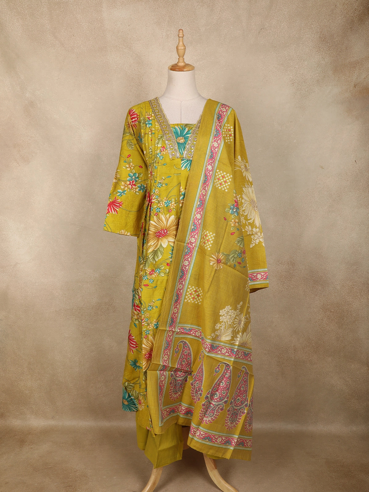 Paired with matching bottoms and a beautifully coordinated printed dupatta featuring floral and paisley motifs, the ensemble comes together with artistic elegance. The dupatta’s intricate border detailing adds the perfect finishing touch, making the outfit look complete and effortlessly stylish.