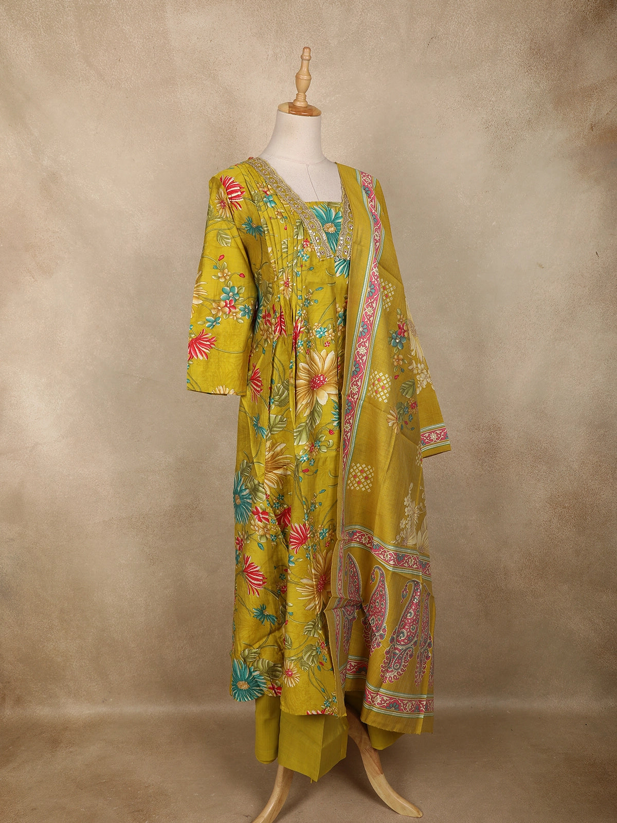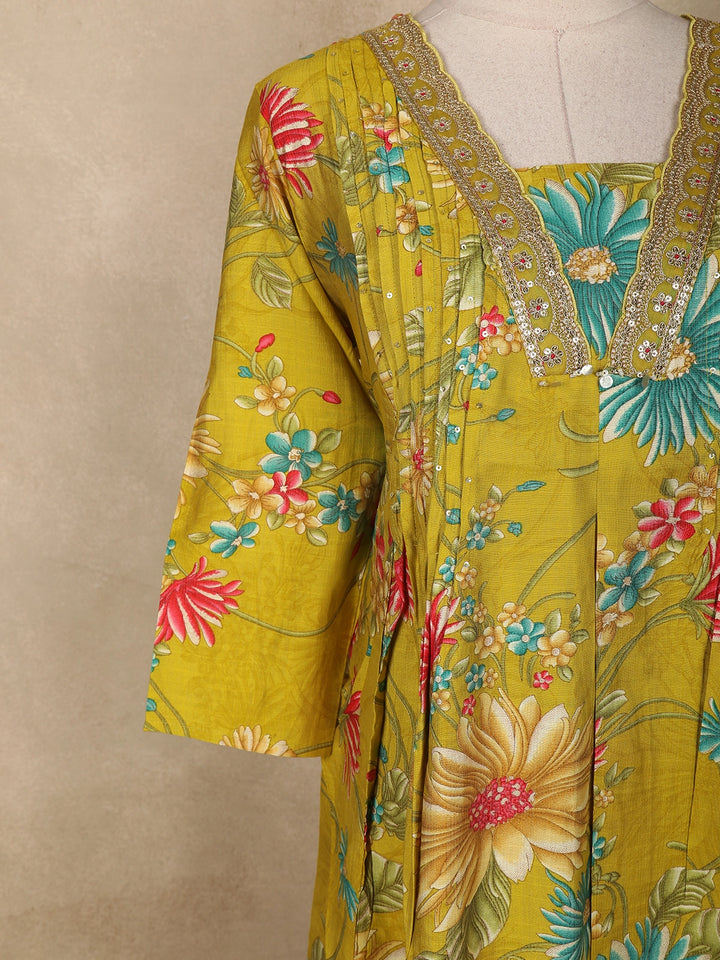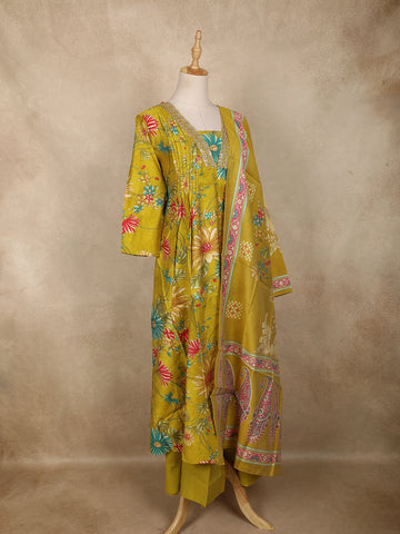 Mustard Yellow Floral Printed Design Cotton Anarkali Salwar Suit with Dupatta