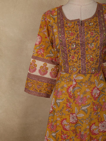 Brighten your ethnic wardrobe with this Mustard Yellow Cotton Salwar Suit, a perfect blend of tradition and everyday elegance. The rich mustard base radiates warmth and vibrancy, beautifully enhanced by intricate floral prints in soft pink, ivory, and subtle green tones that add a fresh, graceful charm.