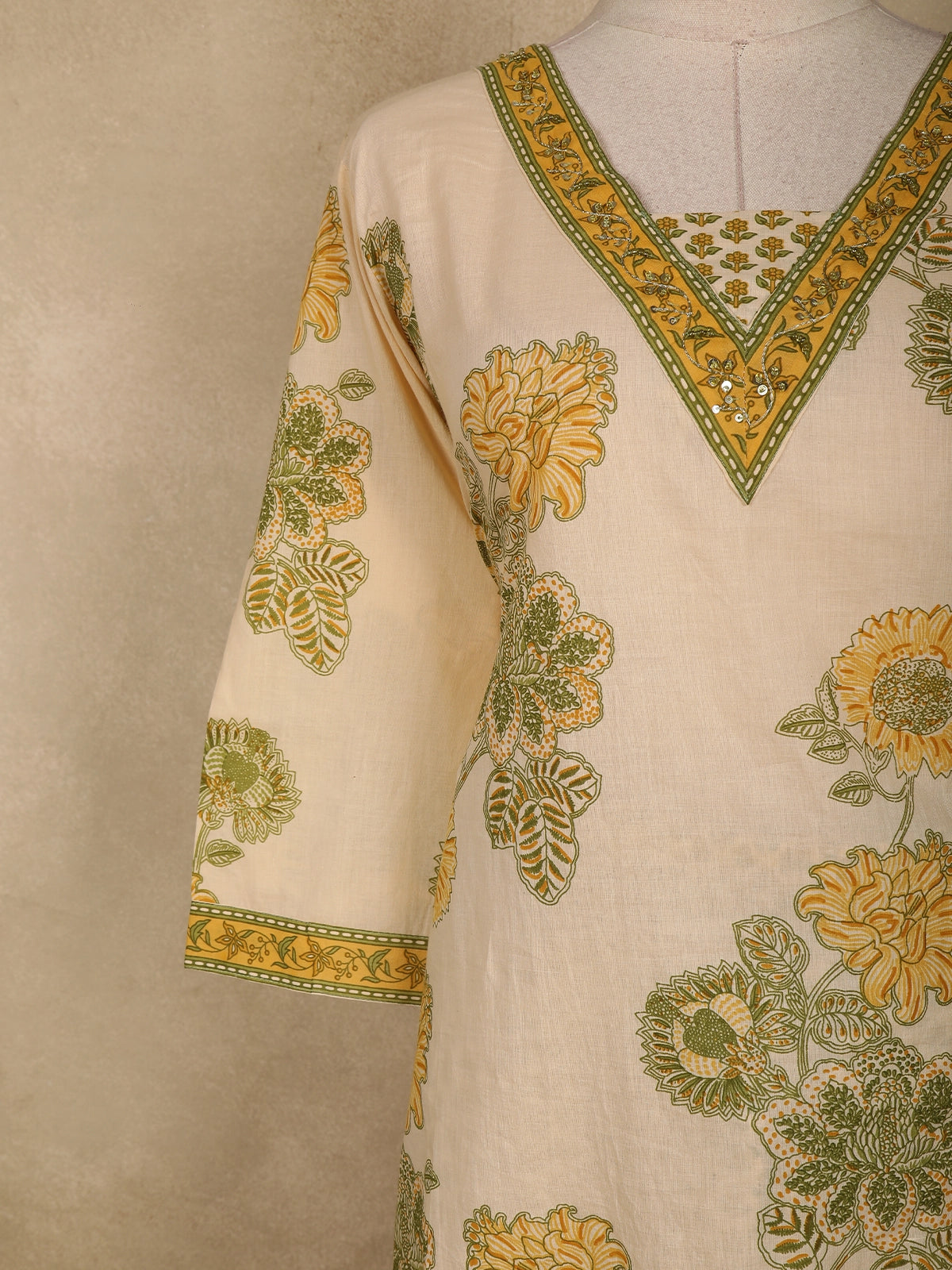 The rich maroon base is beautifully enhanced with delicate floral prints in soft beige and muted tones, giving the ensemble a graceful and feminine appeal. The highlight of the kurta is its intricately embroidered V-shaped neckline, adorned with fine thread work that adds a subtle festive touch without overwhelming the overall design. The three-quarter sleeves are finished with matching embroidered borders, lending a refined and cohesive look.