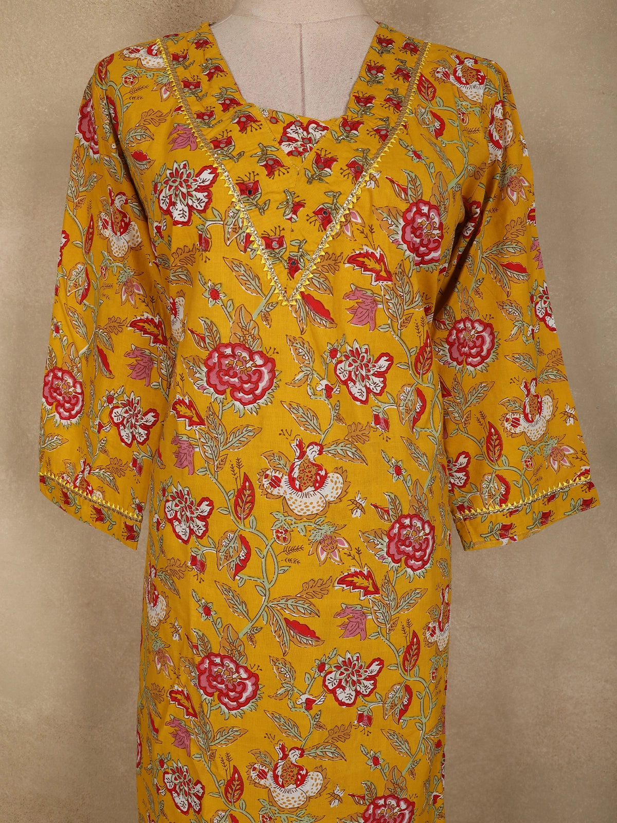 The kurta showcases a classic V-neckline, lending a subtle traditional charm, while the three-quarter sleeves ensure ease of movement and all-day comfort. The straight-cut silhouette offers a flattering fit, making it suitable for daily wear as well as relaxed office settings.