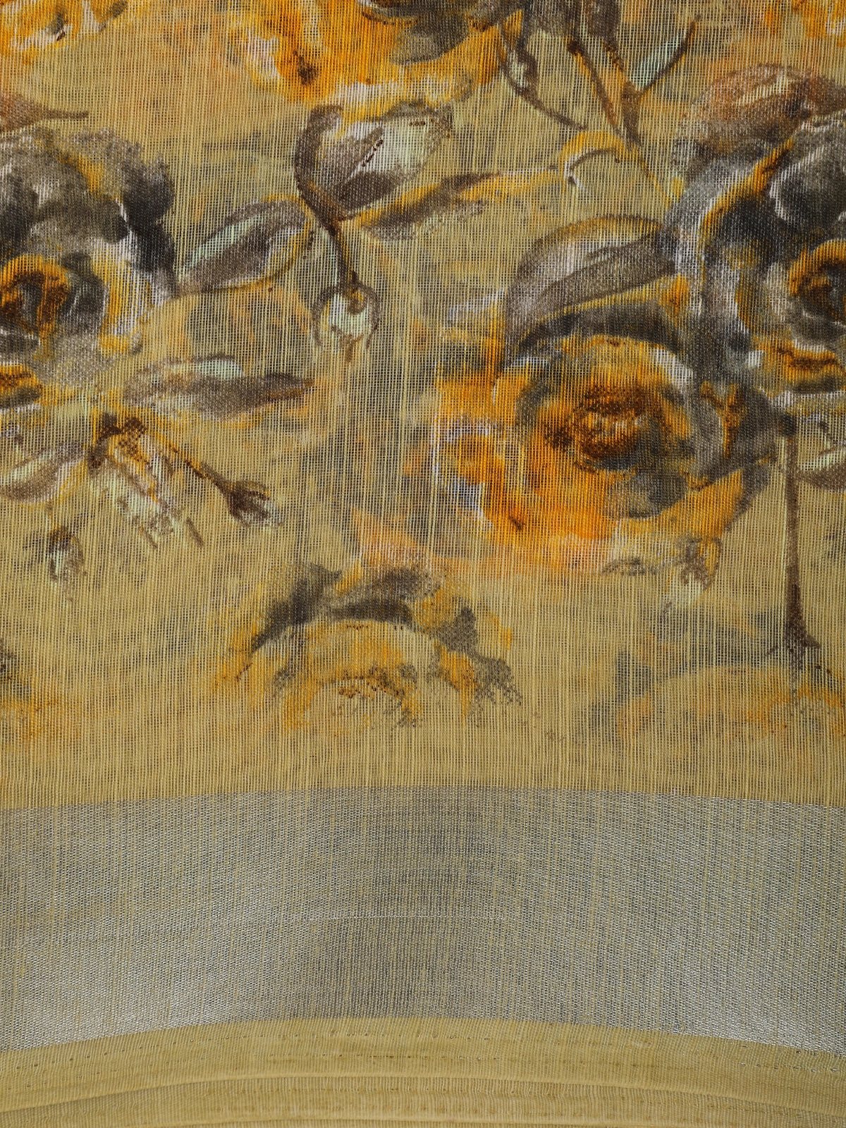 Mustard Yellow Floral Printed Design Mixed Cotton Saree