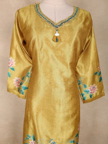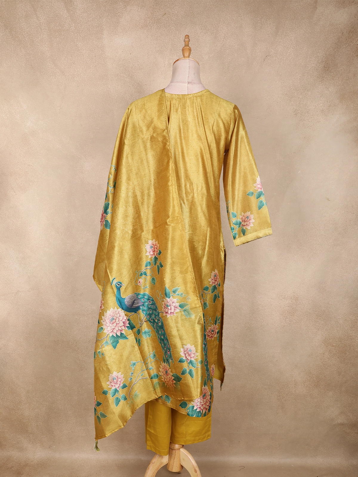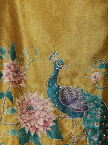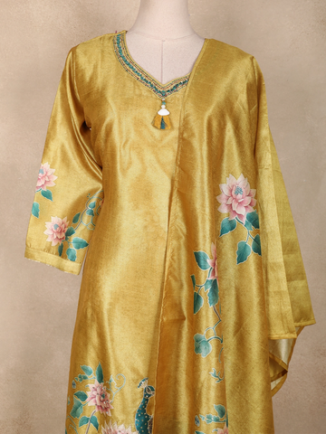 Radiating timeless elegance with a touch of artistic charm, this Mustard Yellow Silk Straight Cut Salwar Suit is a perfect blend of tradition and contemporary grace. Crafted from smooth silk fabric, the kurta features a rich mustard yellow base highlighted by delicate floral prints and a graceful peacock-inspired motif, lending the ensemble a refined ethnic appeal.