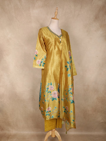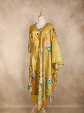 Mustard Yellow Floral Printed Design Tissue Silk Straight Cut Salwar Suit with Dupatta