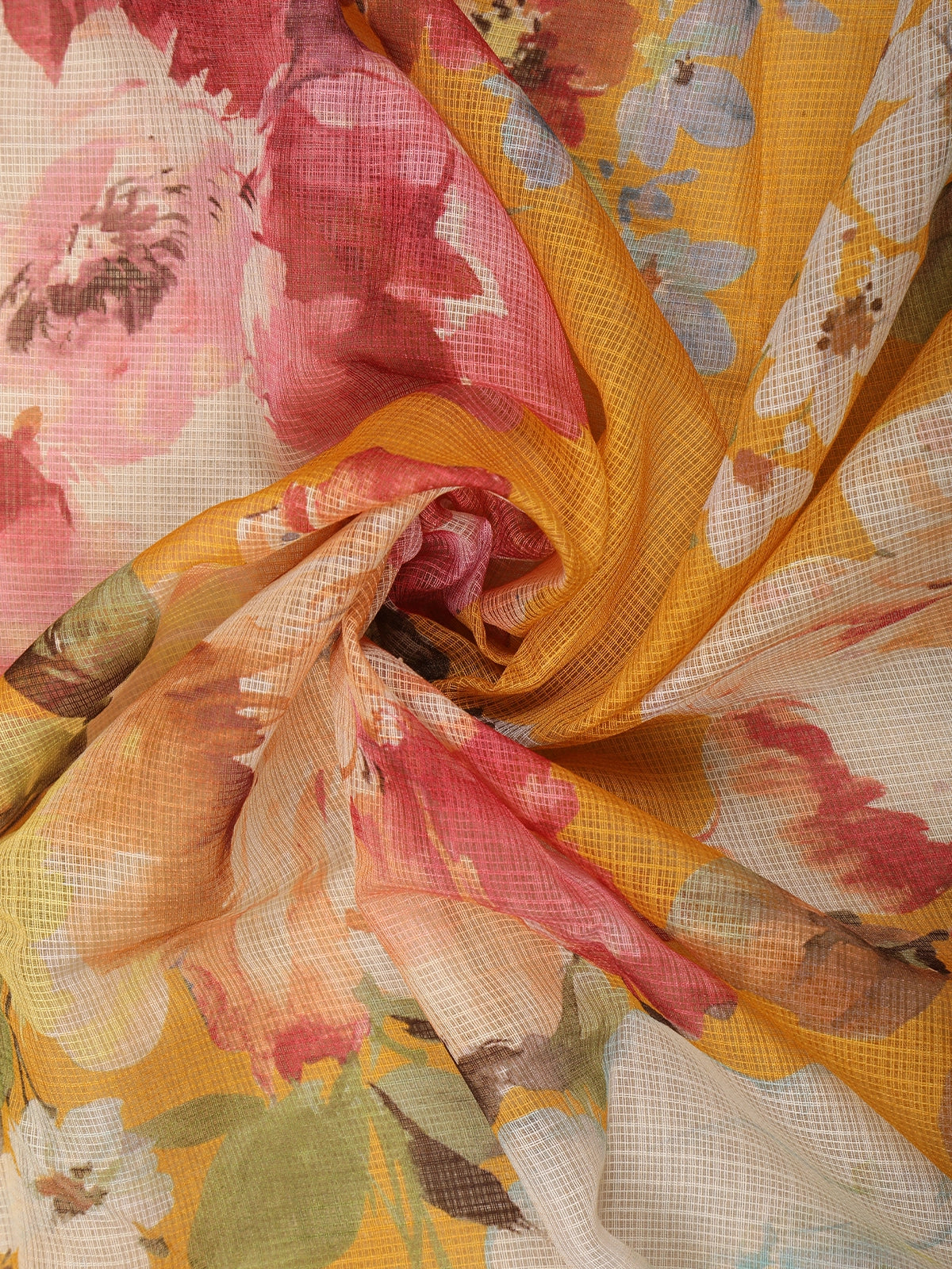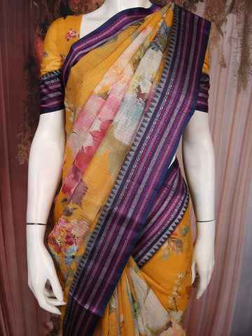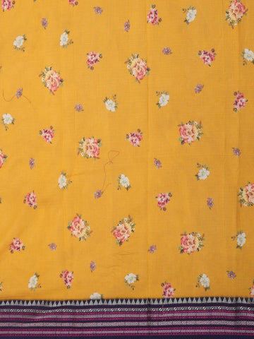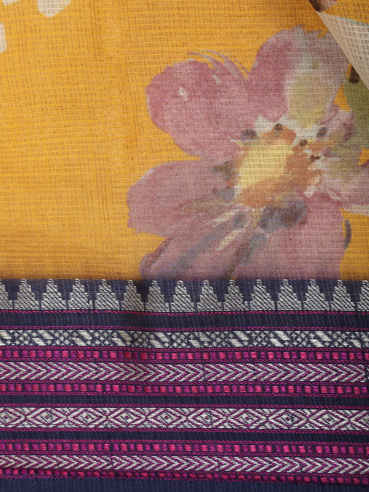 Mustard Yellow Floral Printed Kota Cotton Saree with Contrast Woven Border