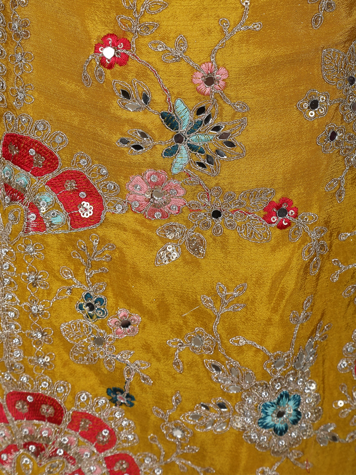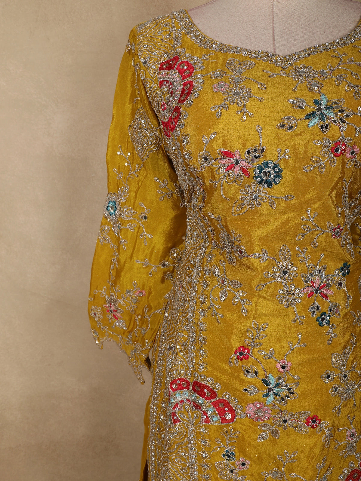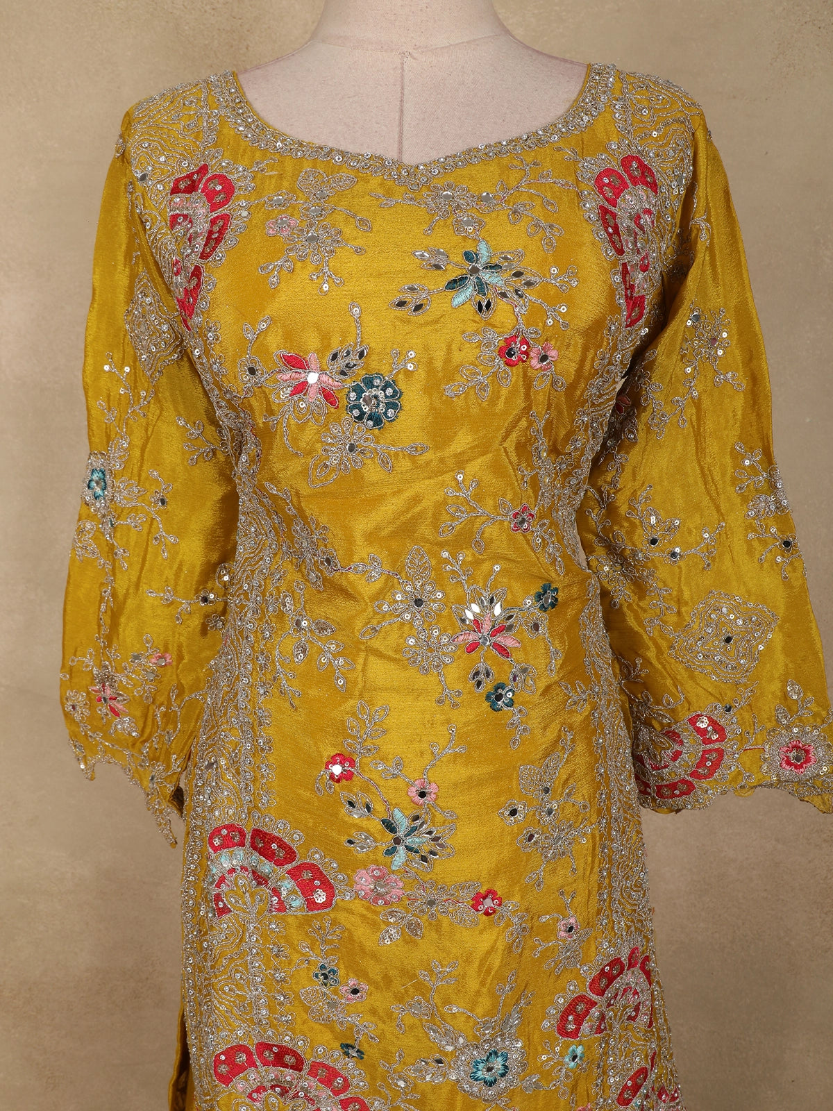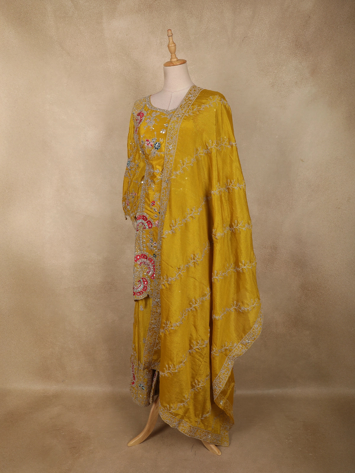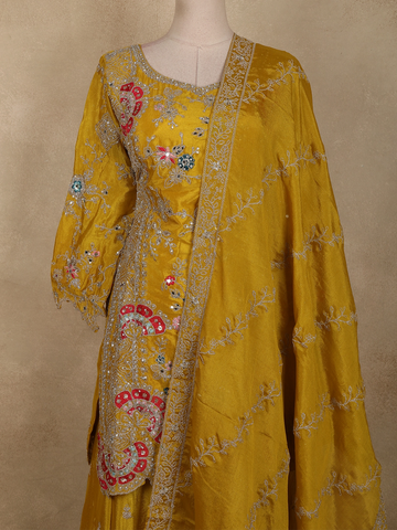 Mustard Yellow Floral Thread and Beads Embroidered Design Silk Palazzo Suit with Dupatta
