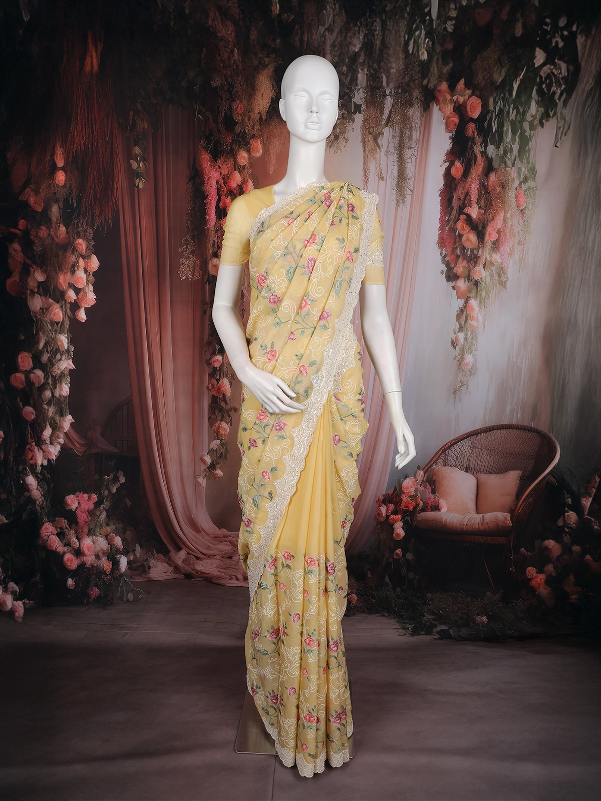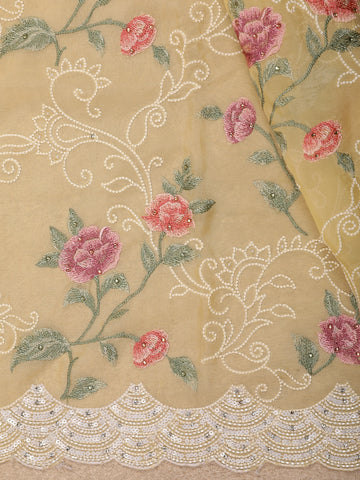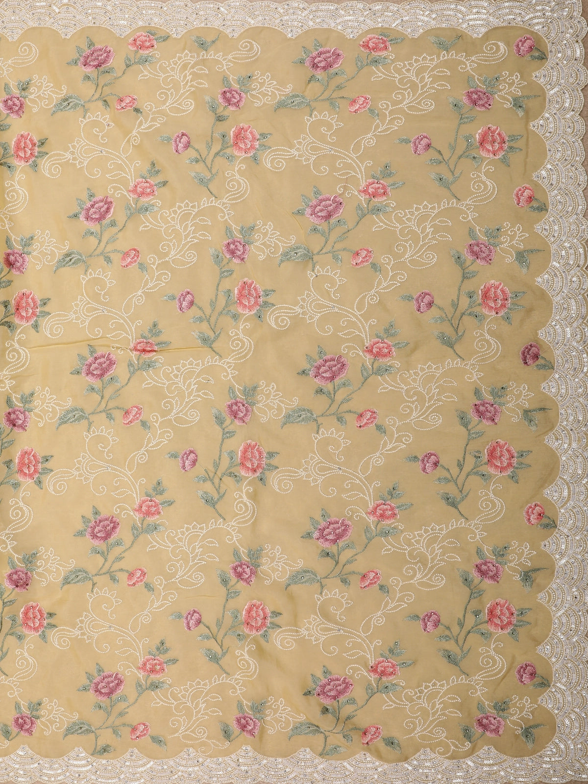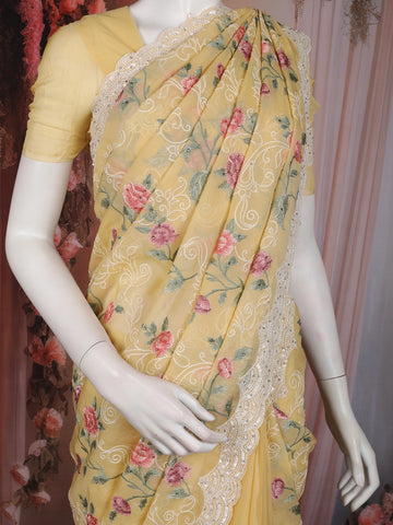Mustard Yellow Floral Thread Embroidered Design Georgette Designer Saree