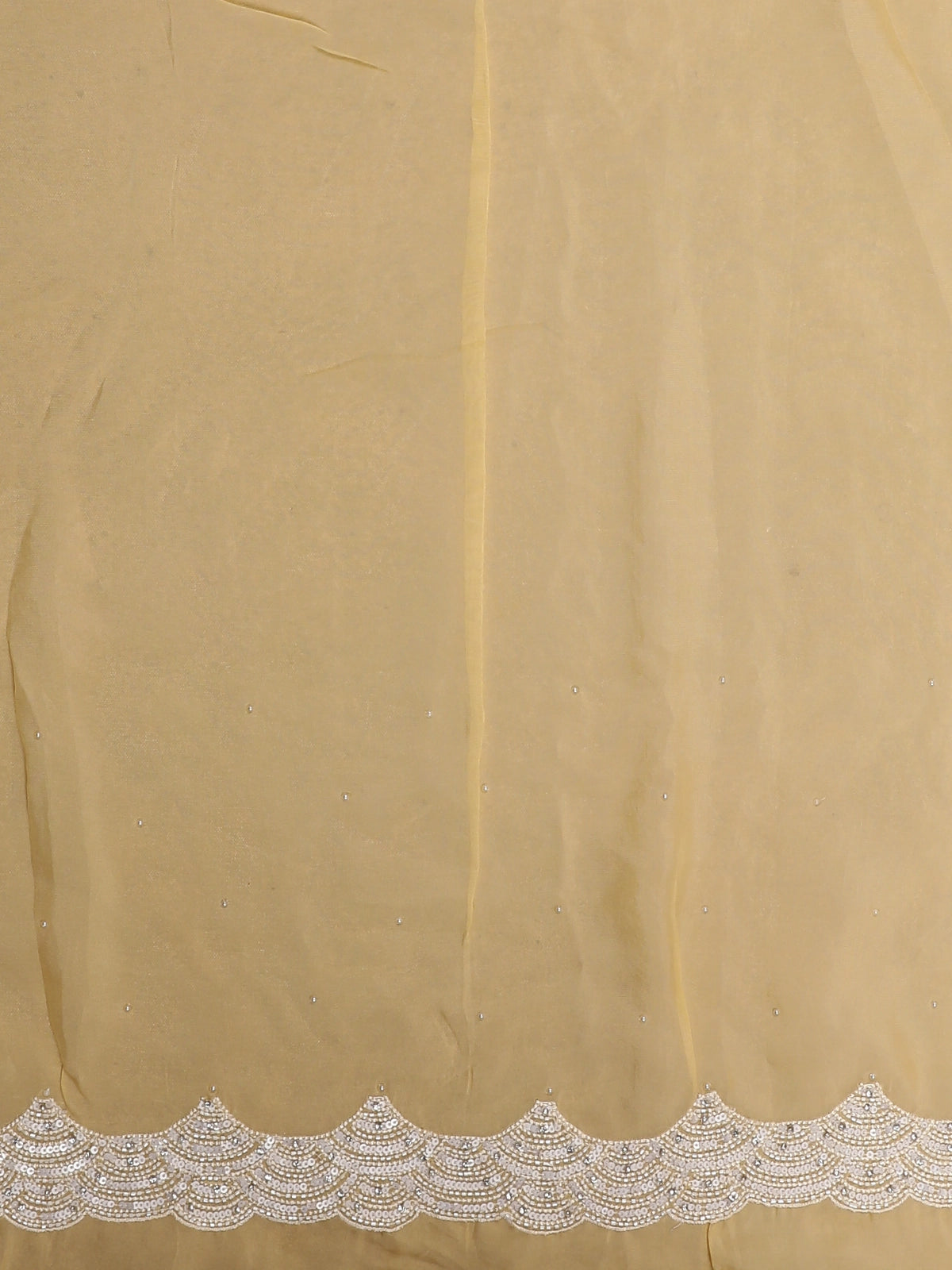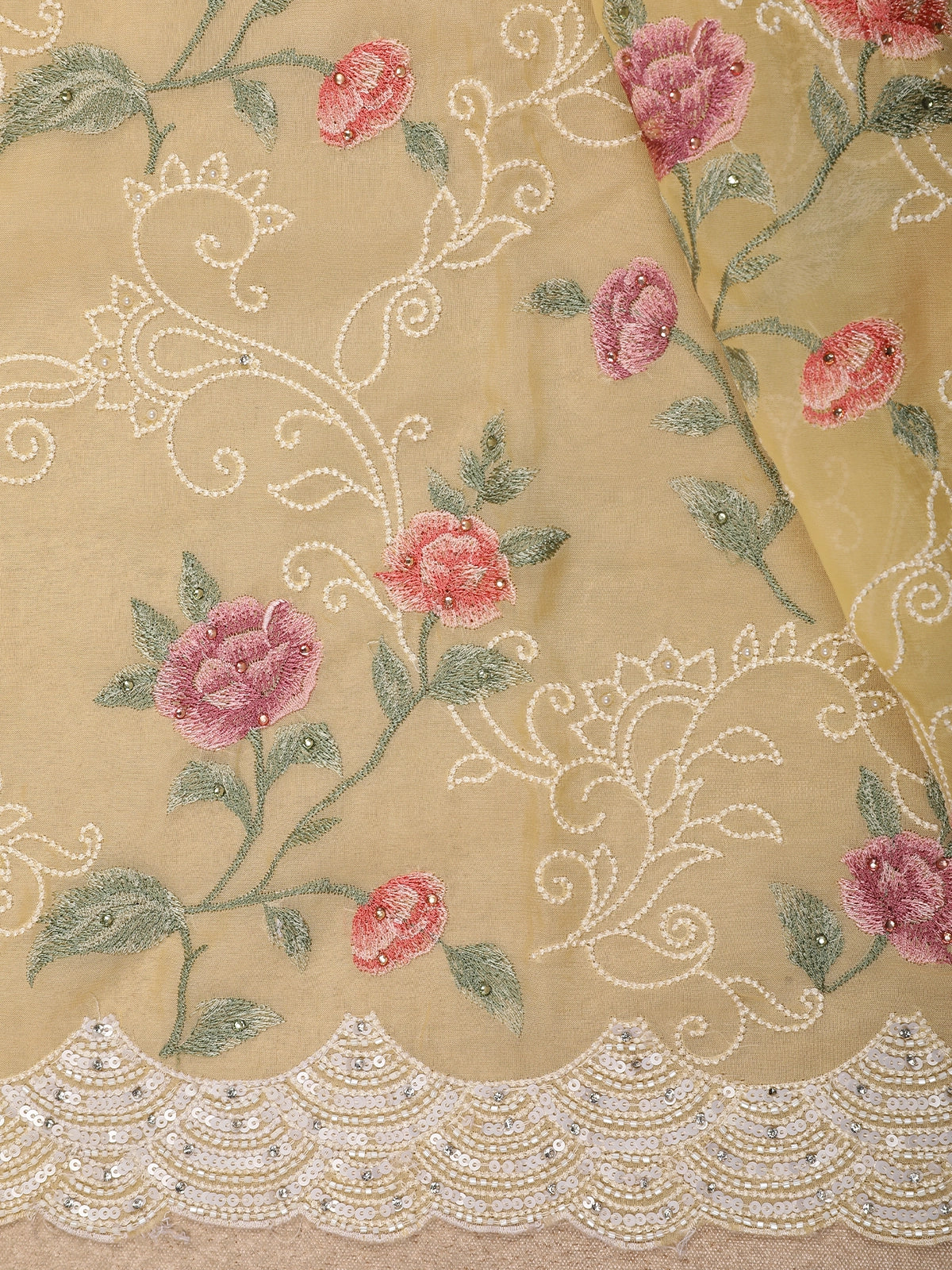 The highlight of this ensemble is its intricately embroidered scalloped border, enhanced with fine threadwork and subtle shimmer that adds depth and sophistication without overpowering the design. The lightweight organza fabric creates an airy, fluid drape, making it comfortable to wear while maintaining a luxurious silhouette.