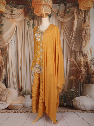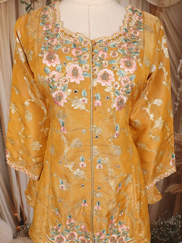 Mustard Yellow Floral Thread Embroidered Design Organza Palazzo Suit
