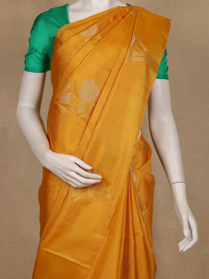 Radiate festive elegance in this stunning Mustard Yellow Soft Silk Saree, adorned with delicate floral woven motifs that enhance its traditional charm. The smooth silk texture adds a lustrous sheen, making it an ideal pick for weddings and celebratory occasions.
