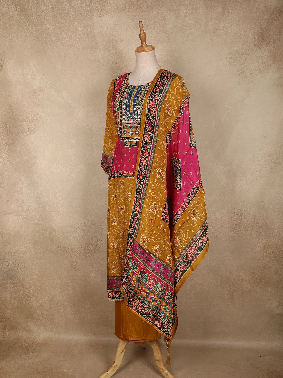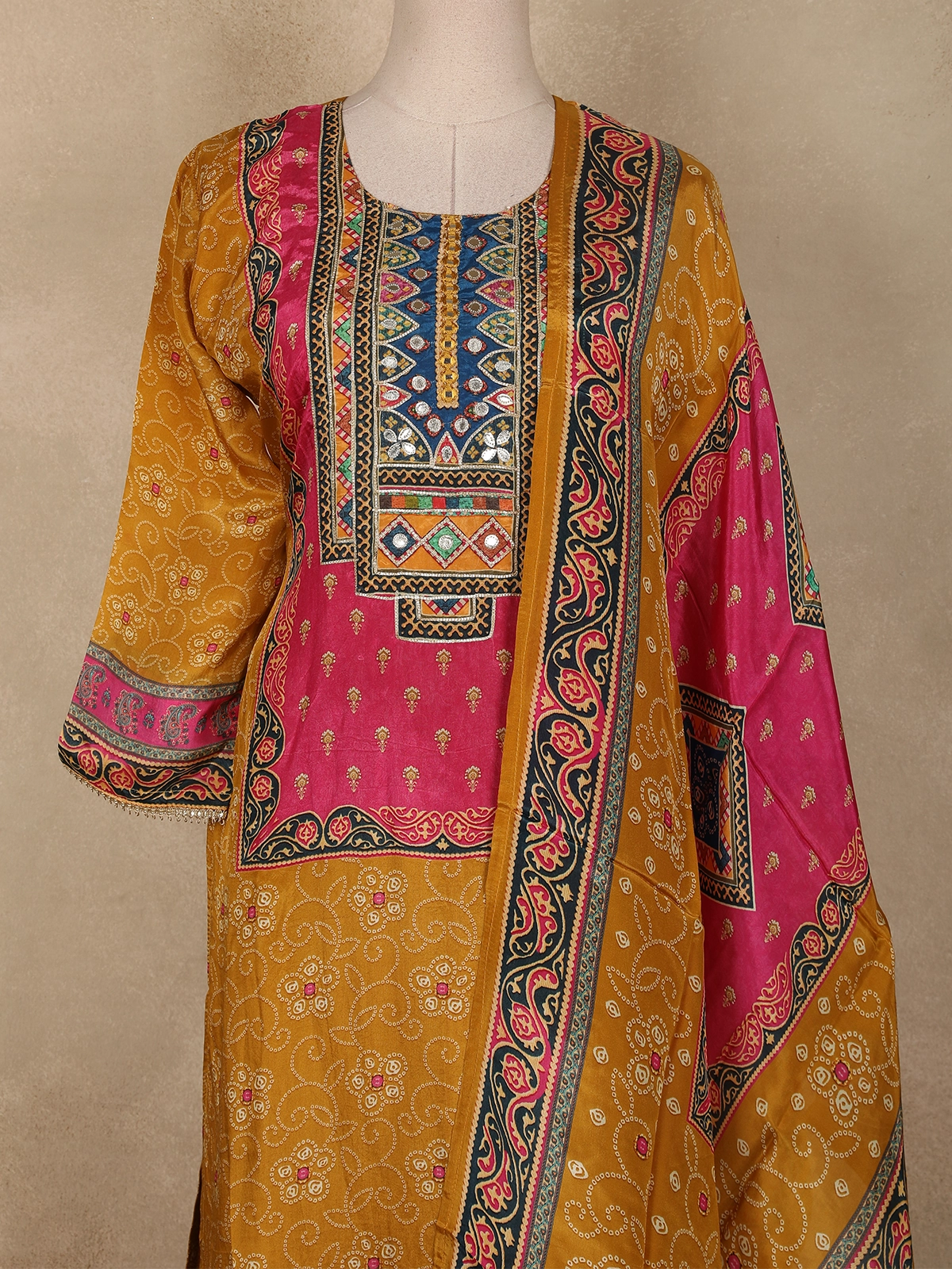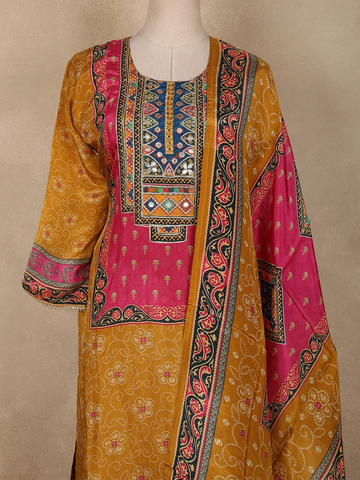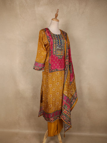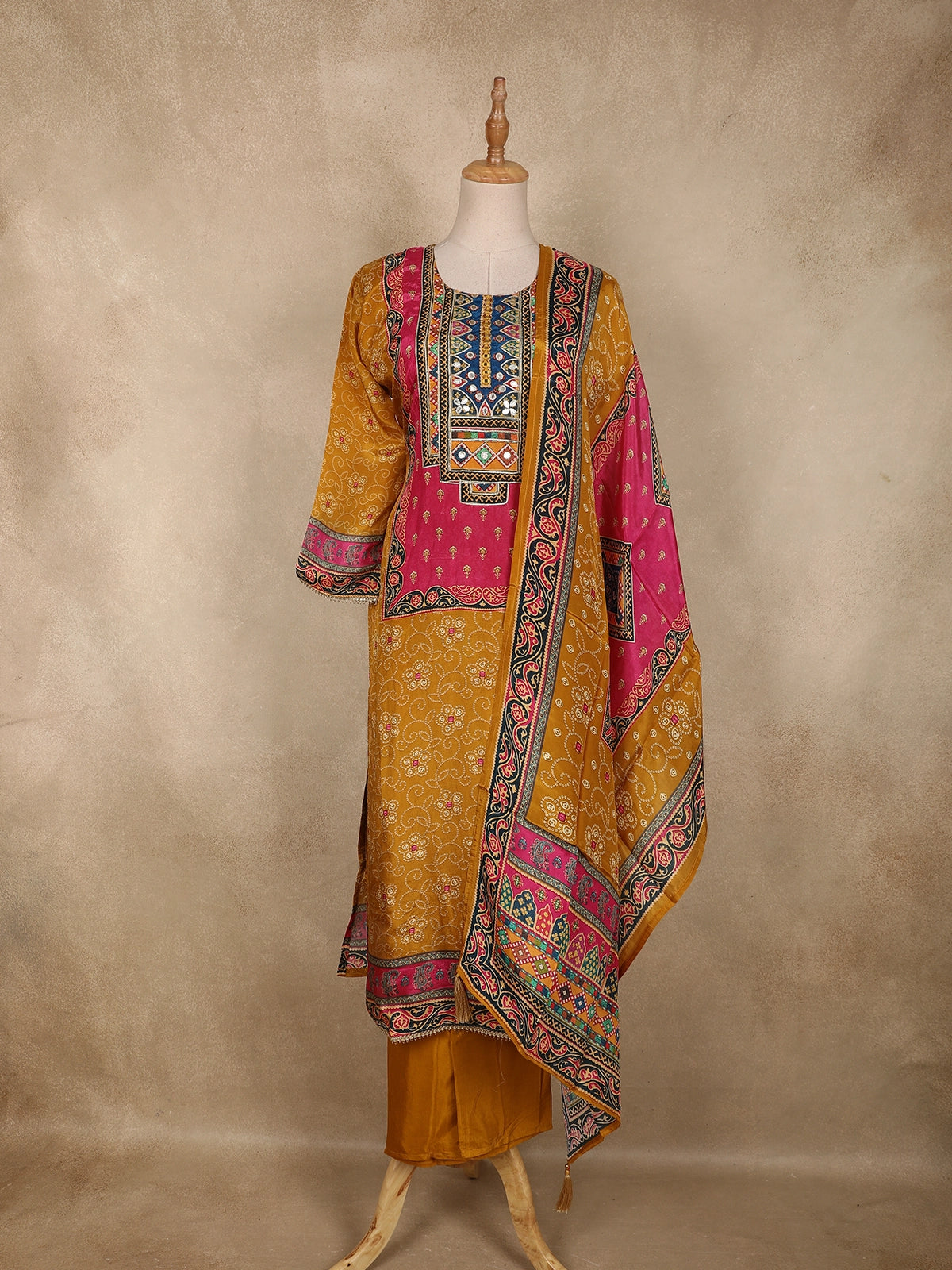 Mustard Yellow Geometric Printed Design Crepe Straight Cut Salwar Suit with Dupatta