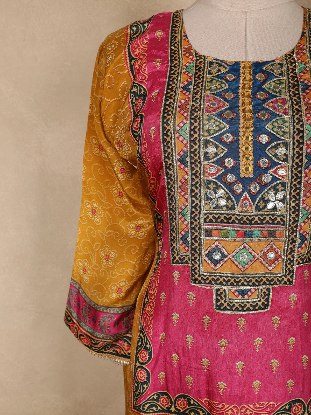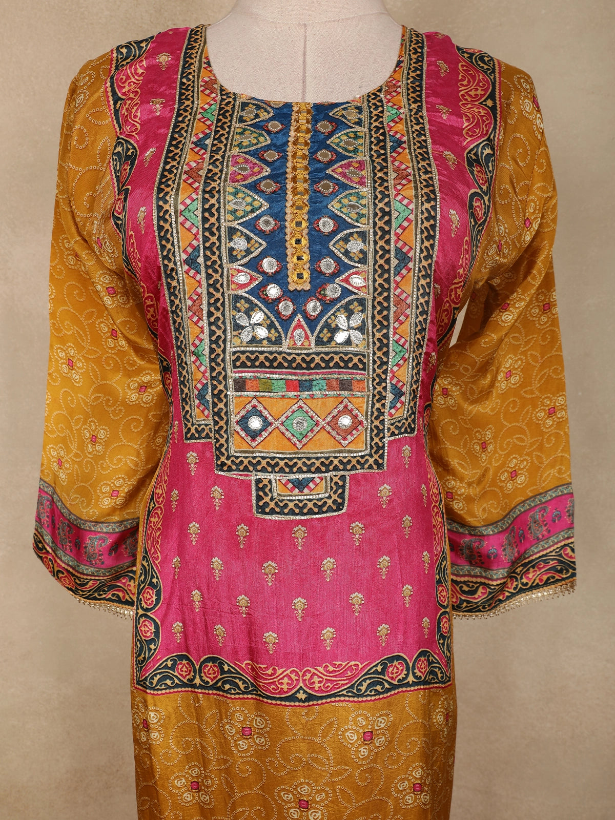 The kurta features a striking geometric and ethnic-inspired print highlighted with contrasting hues that add depth and visual appeal. The straight-cut silhouette ensures a clean, flattering fit, while the round neckline with printed yoke detailing lends a handcrafted, artisanal charm. The 3/4th sleeves, adorned with coordinated border prints, enhance the overall ethnic aesthetic.