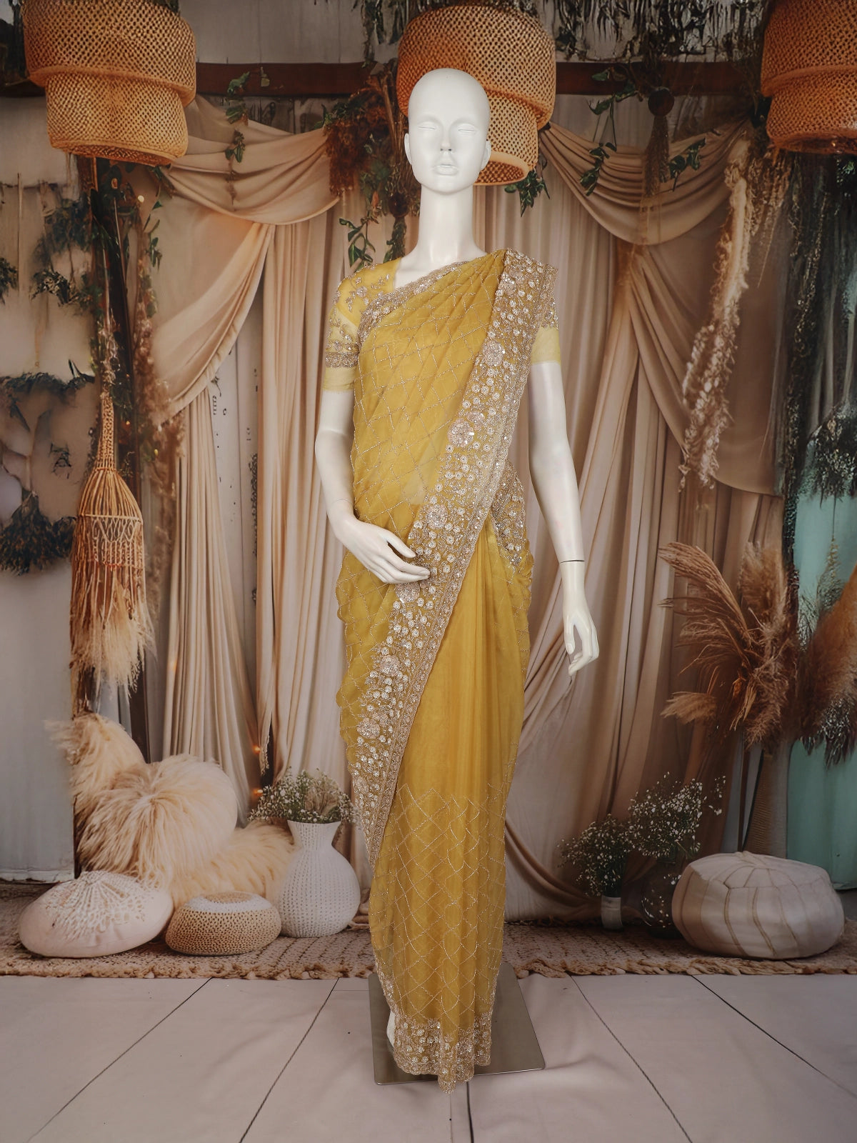 Perfect for weddings, receptions, festive celebrations, cocktail parties, and evening functions, this saree pairs exquisitely with statement jewellery and embellished heels. Designed for women who love sophisticated sparkle and timeless appeal, this mustard yellow designer saree is a true celebration of modern luxury with traditional finesse.