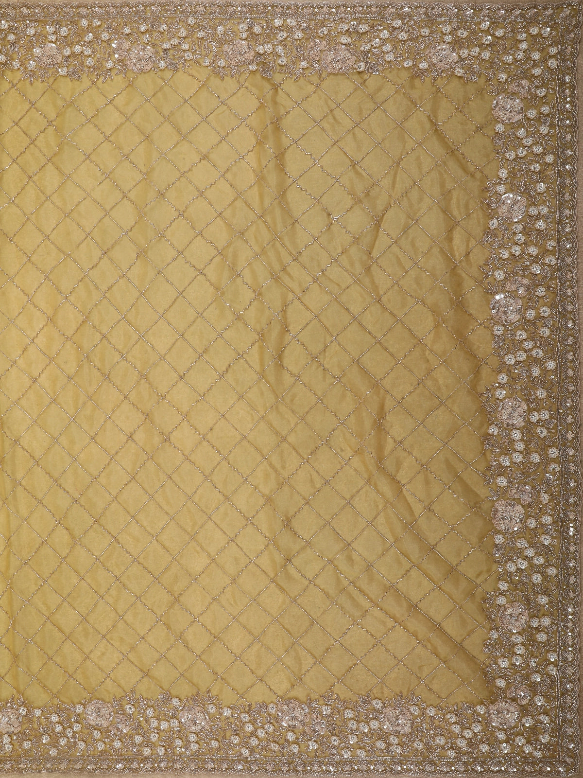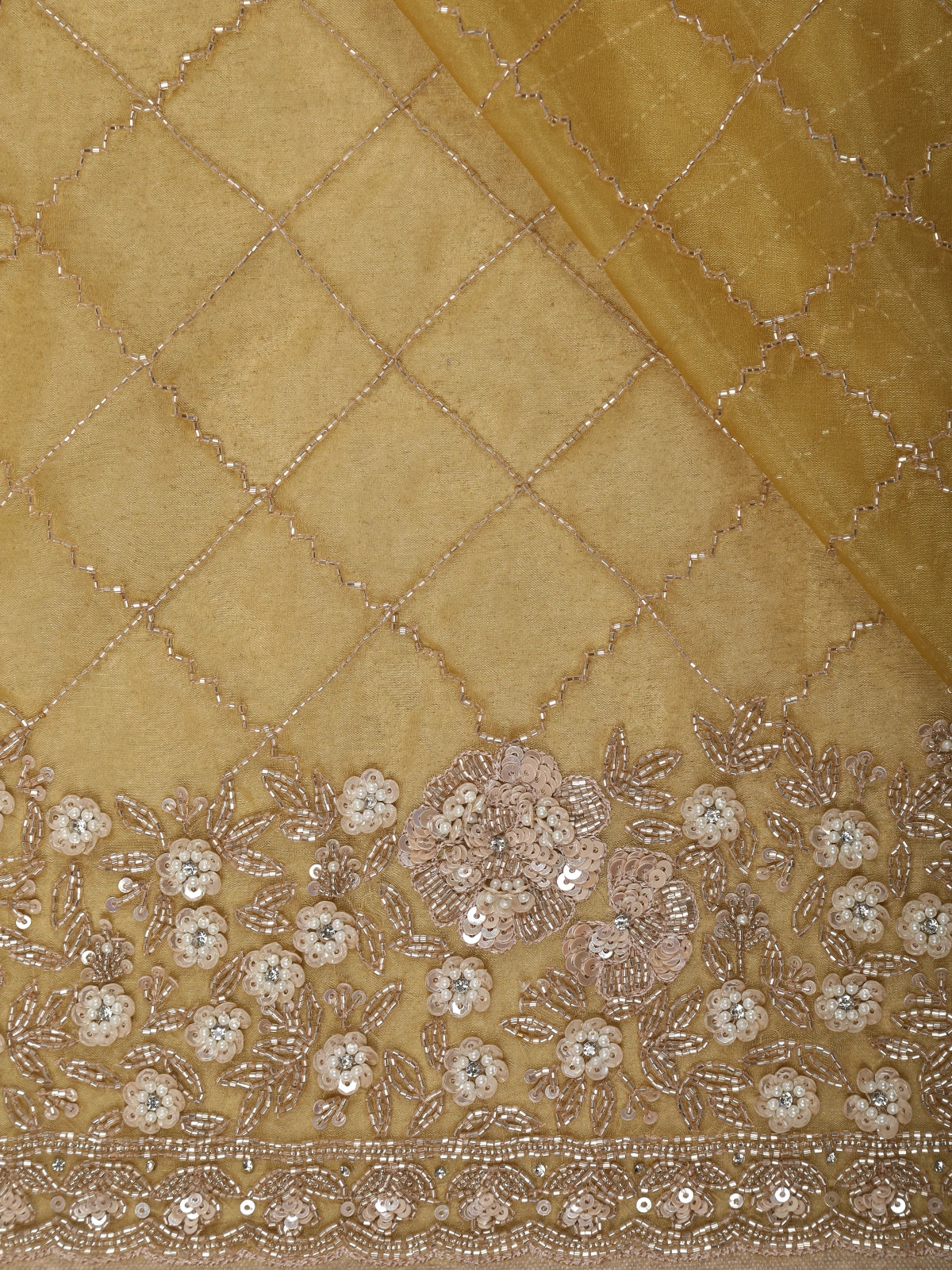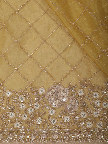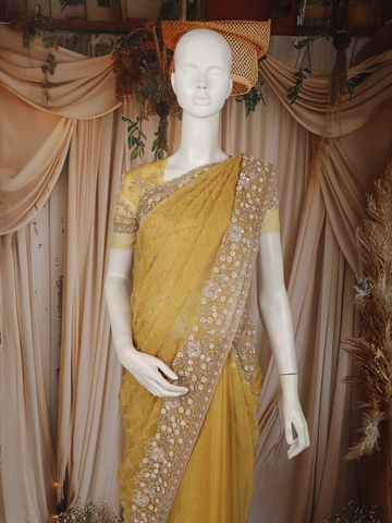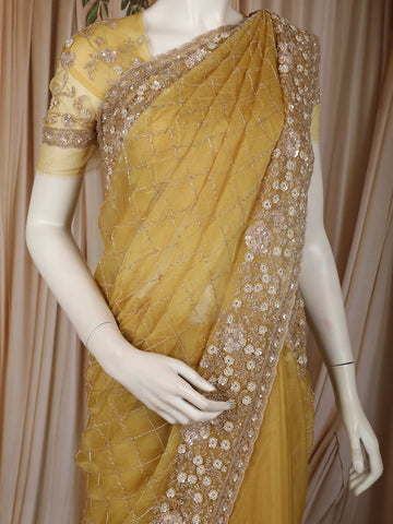 Mustard Yellow Heavy Sequins and Beads Embroidered Design Net Designer Saree