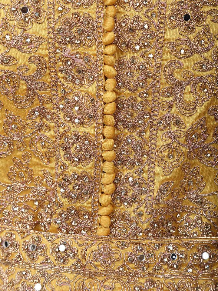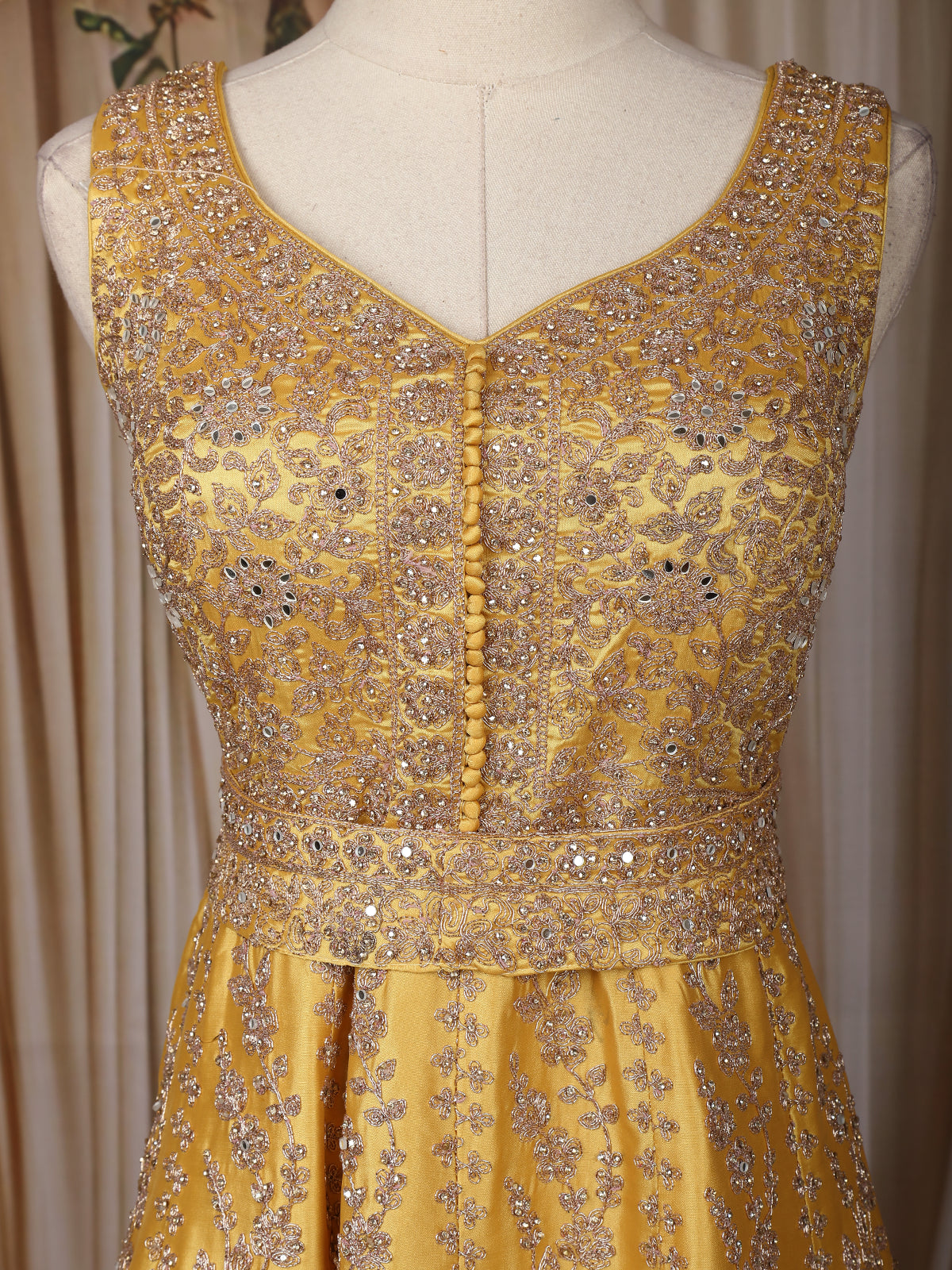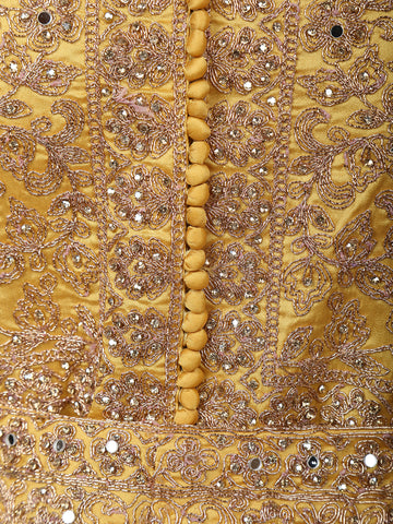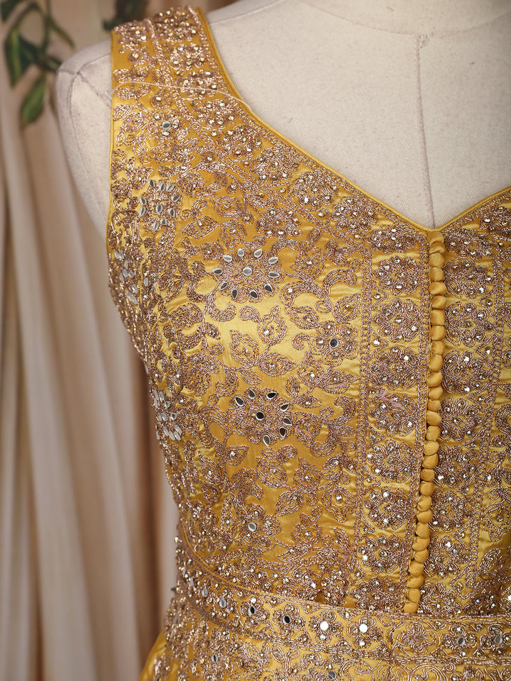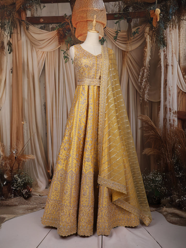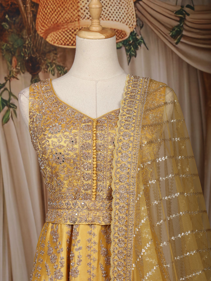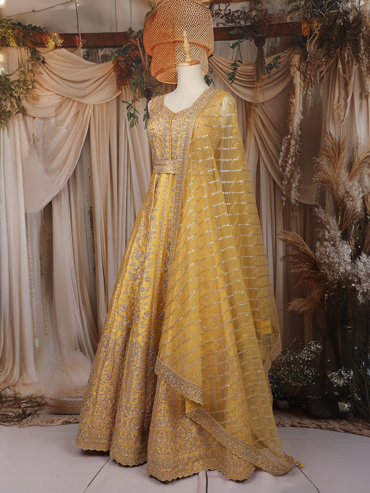 Mustard Yellow Heavy Sequins Embroidered Design Banarasi Silk Gown With Net Dupatta