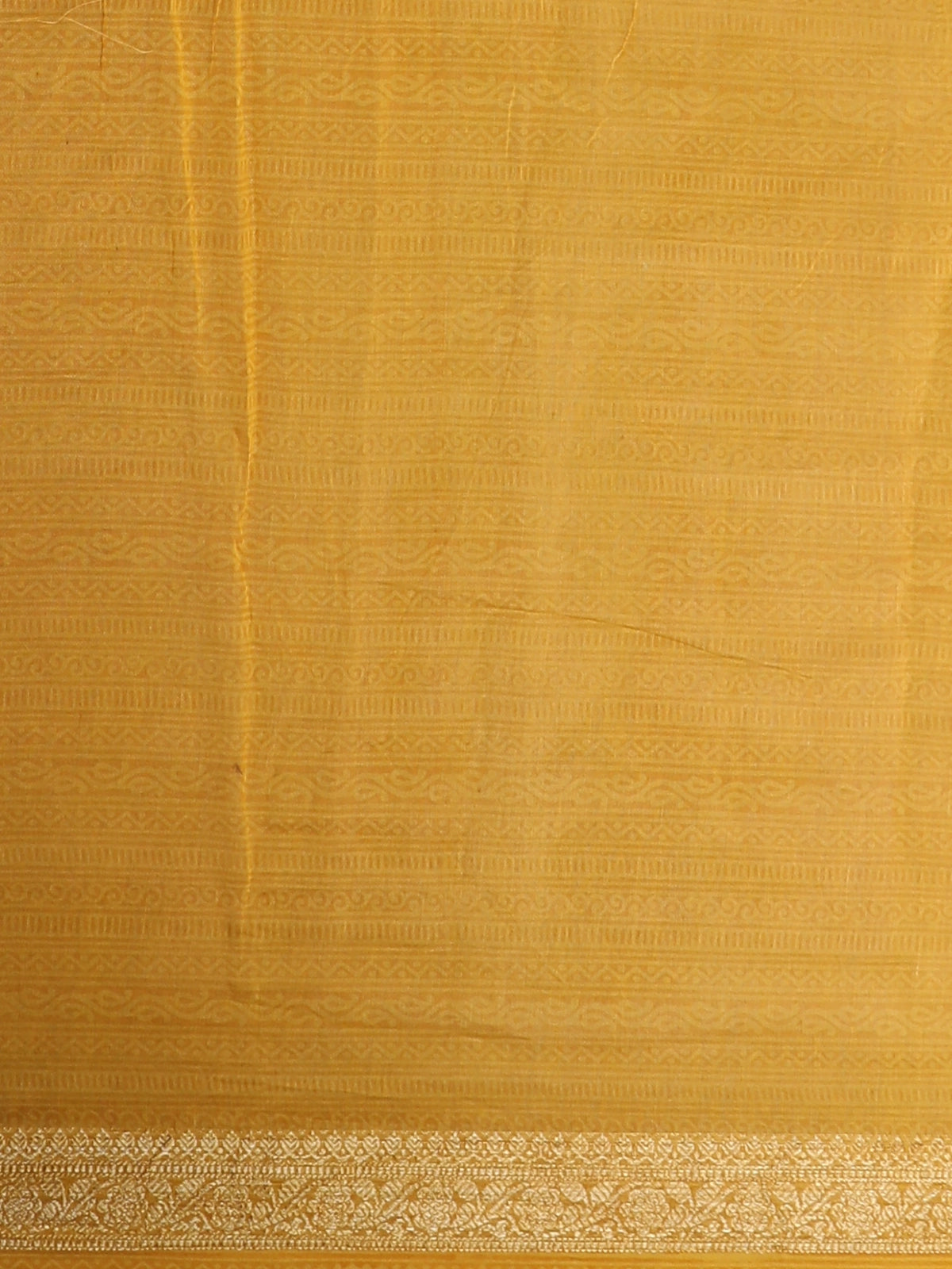 A finely crafted golden zari border adds a touch of opulence, perfectly complementing the rich mustard base. The saree drapes gracefully with a soft sheen and lightweight texture, making it ideal for festive occasions, cultural events, and elegant day celebrations.