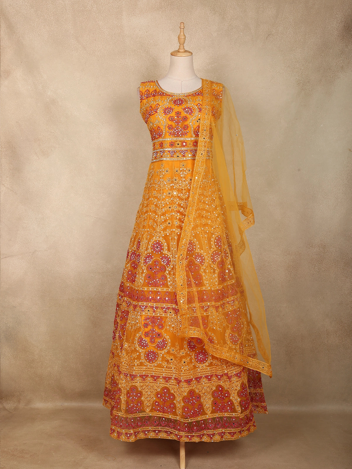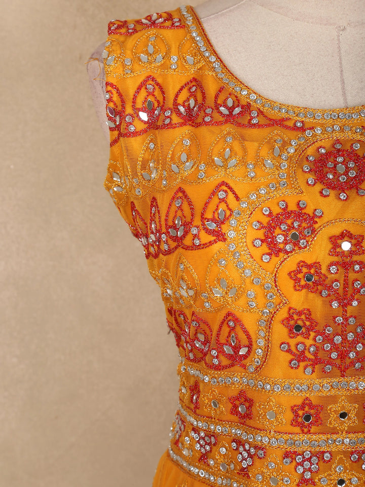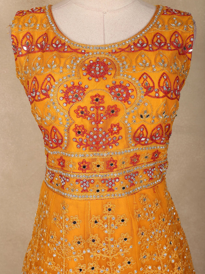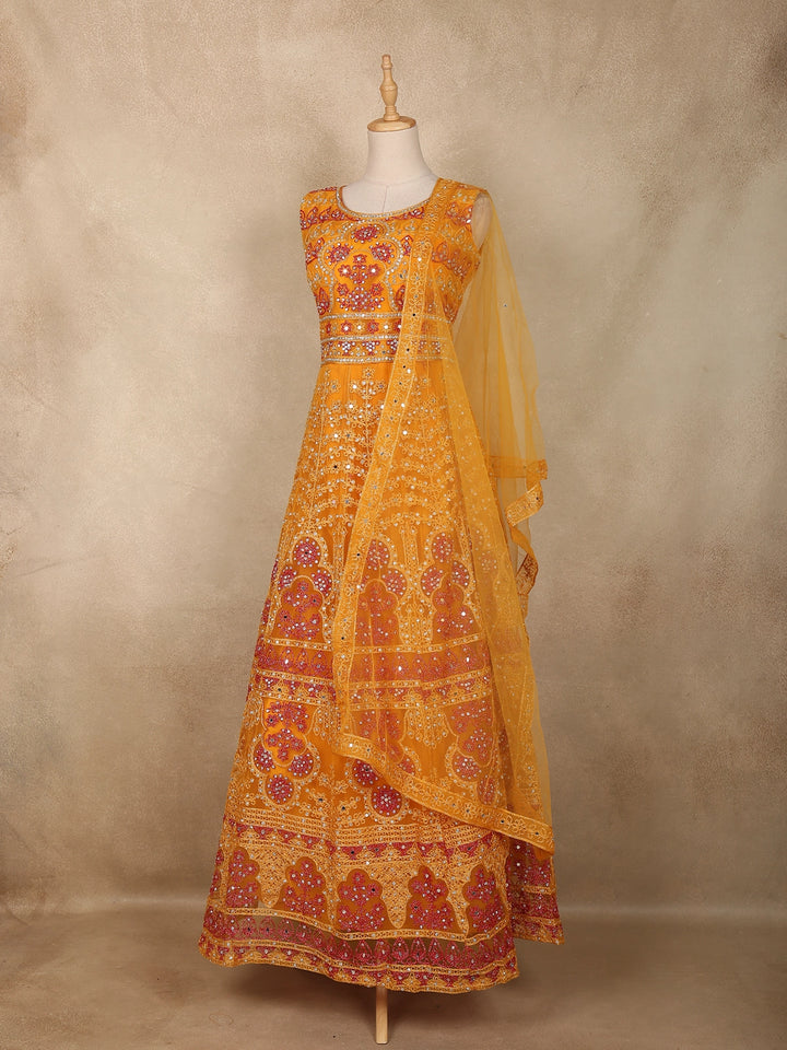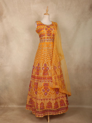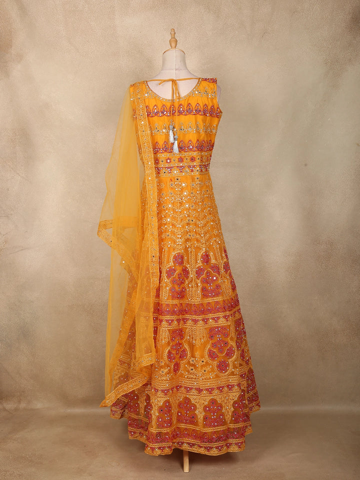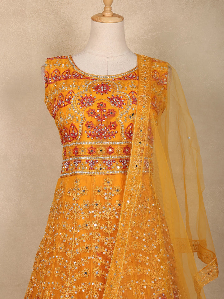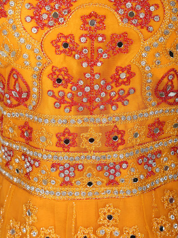 Mustard Yellow Mirror and Thread Embroidered Design Net Lehenga With Net Dupatta