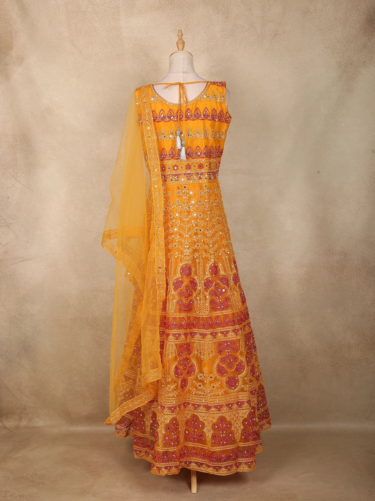 Radiate festive charm and regal elegance with this Mustard Yellow Mirror and Thread Embroidered Net Lehenga, an ensemble that celebrates the spirit of tradition with a vibrant, modern touch. The bright mustard hue, paired with intricate mirror and thread work, captures the essence of festive radiance — perfect for haldi, mehendi, or wedding celebrations.