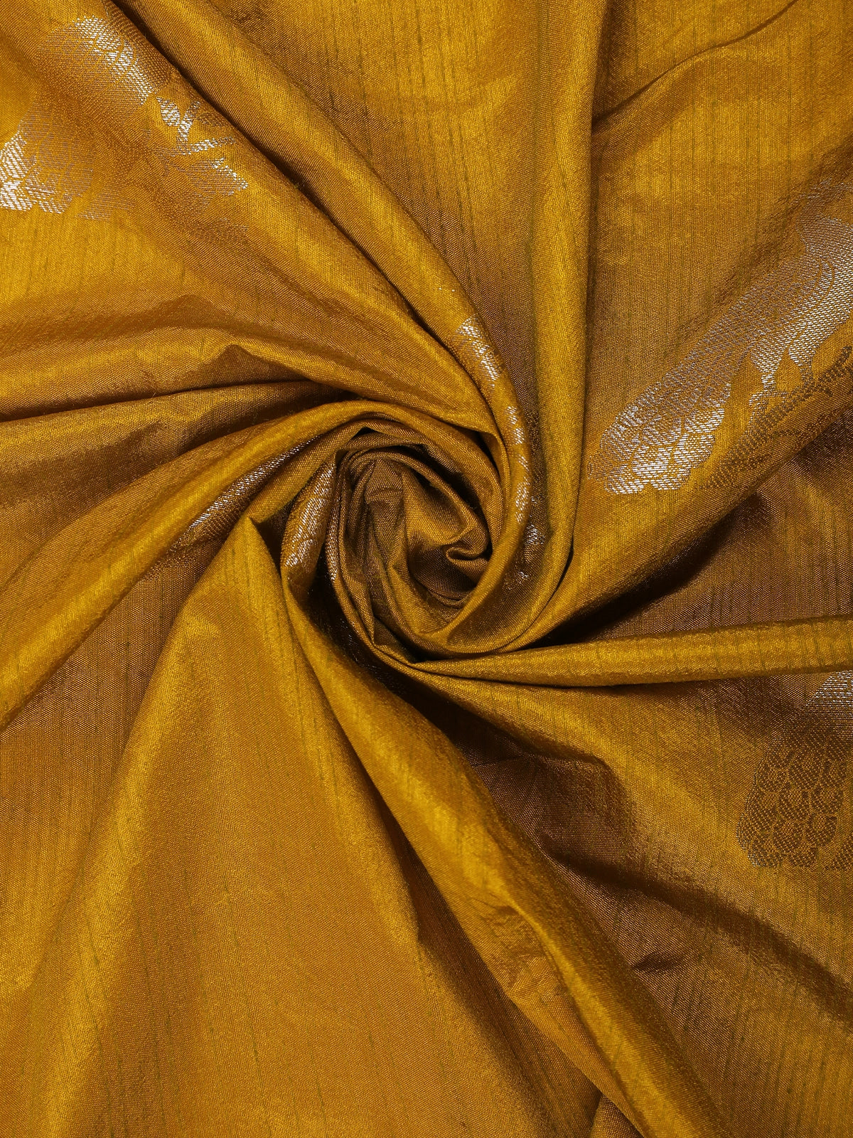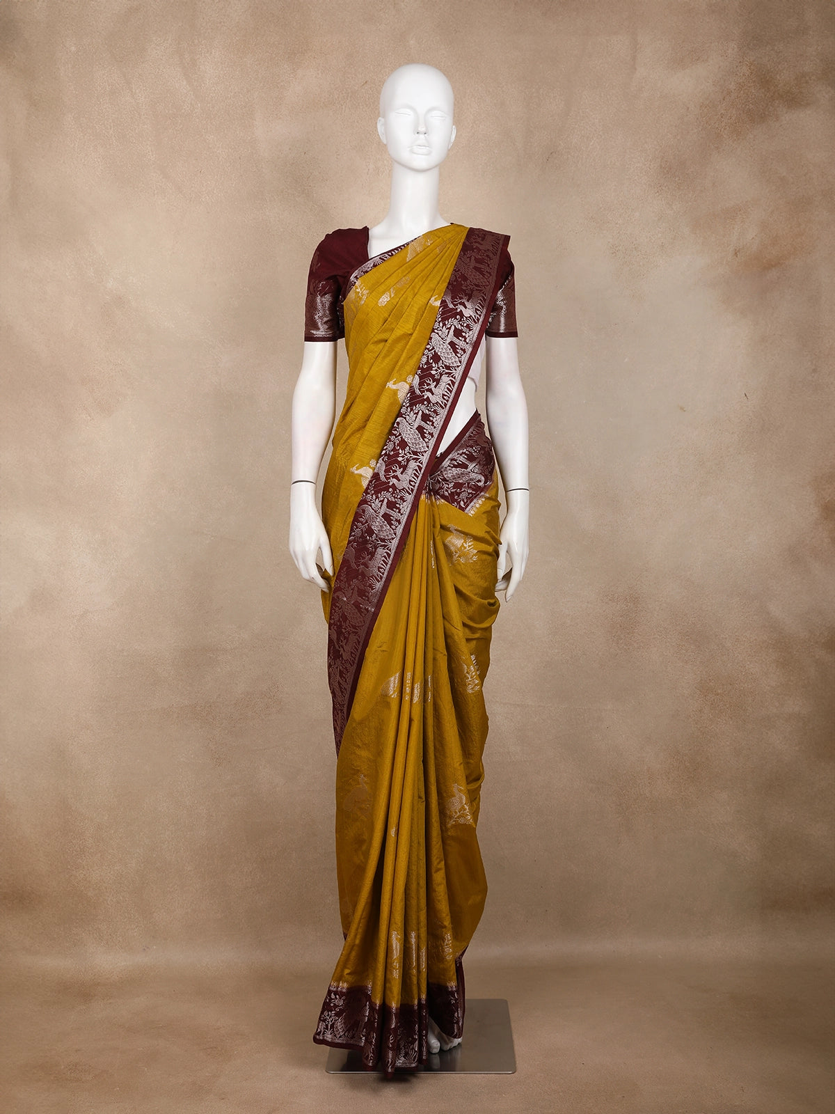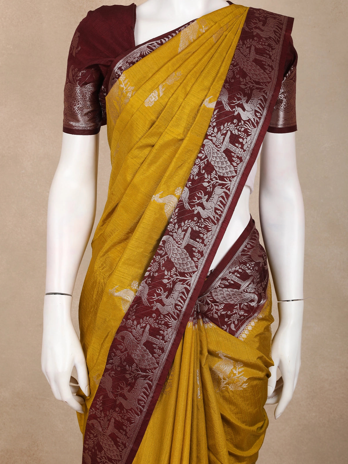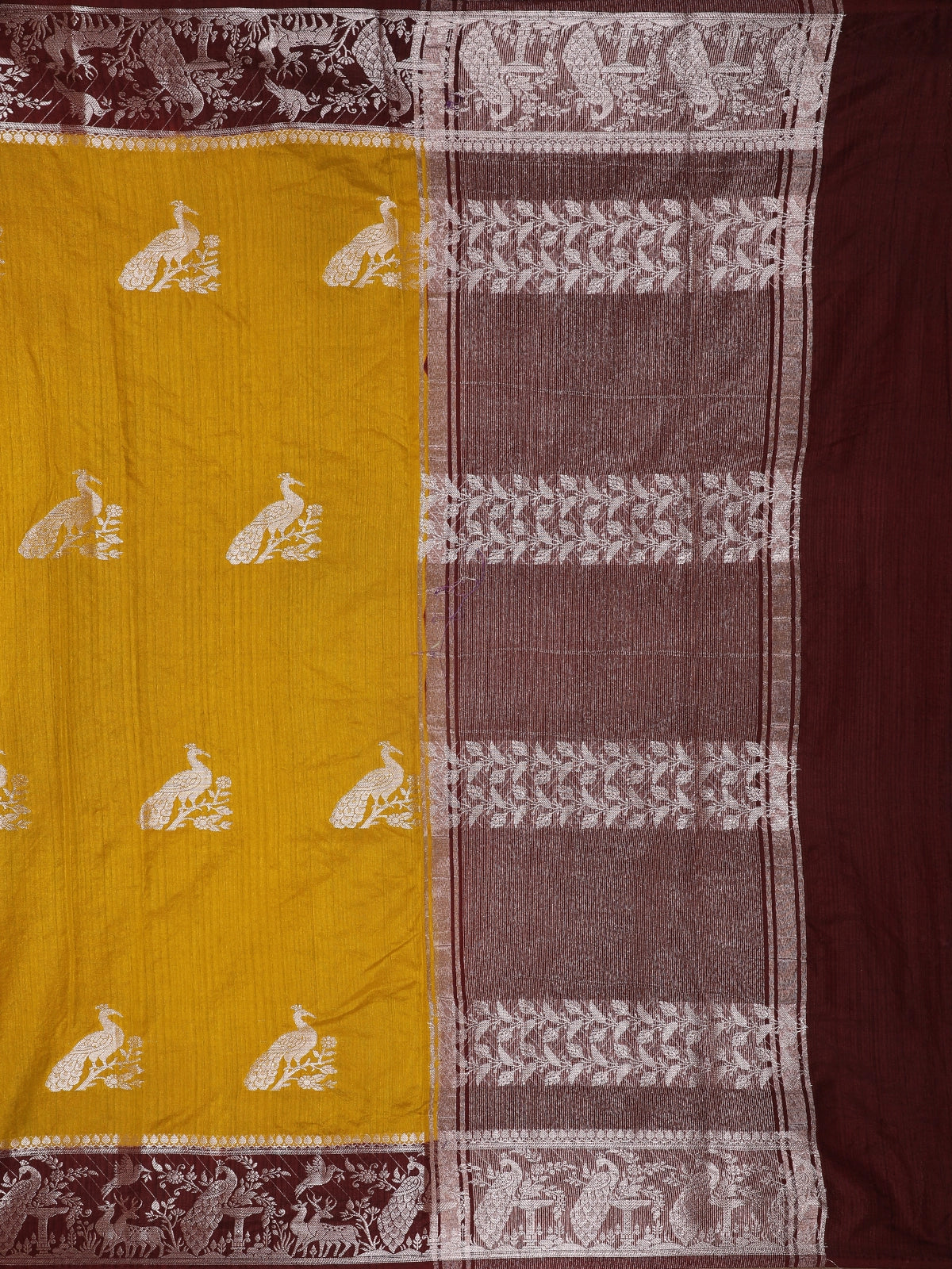 Mustard Yellow Peacock Woven Raw Silk Saree with Contrast Maroon Zari Border
