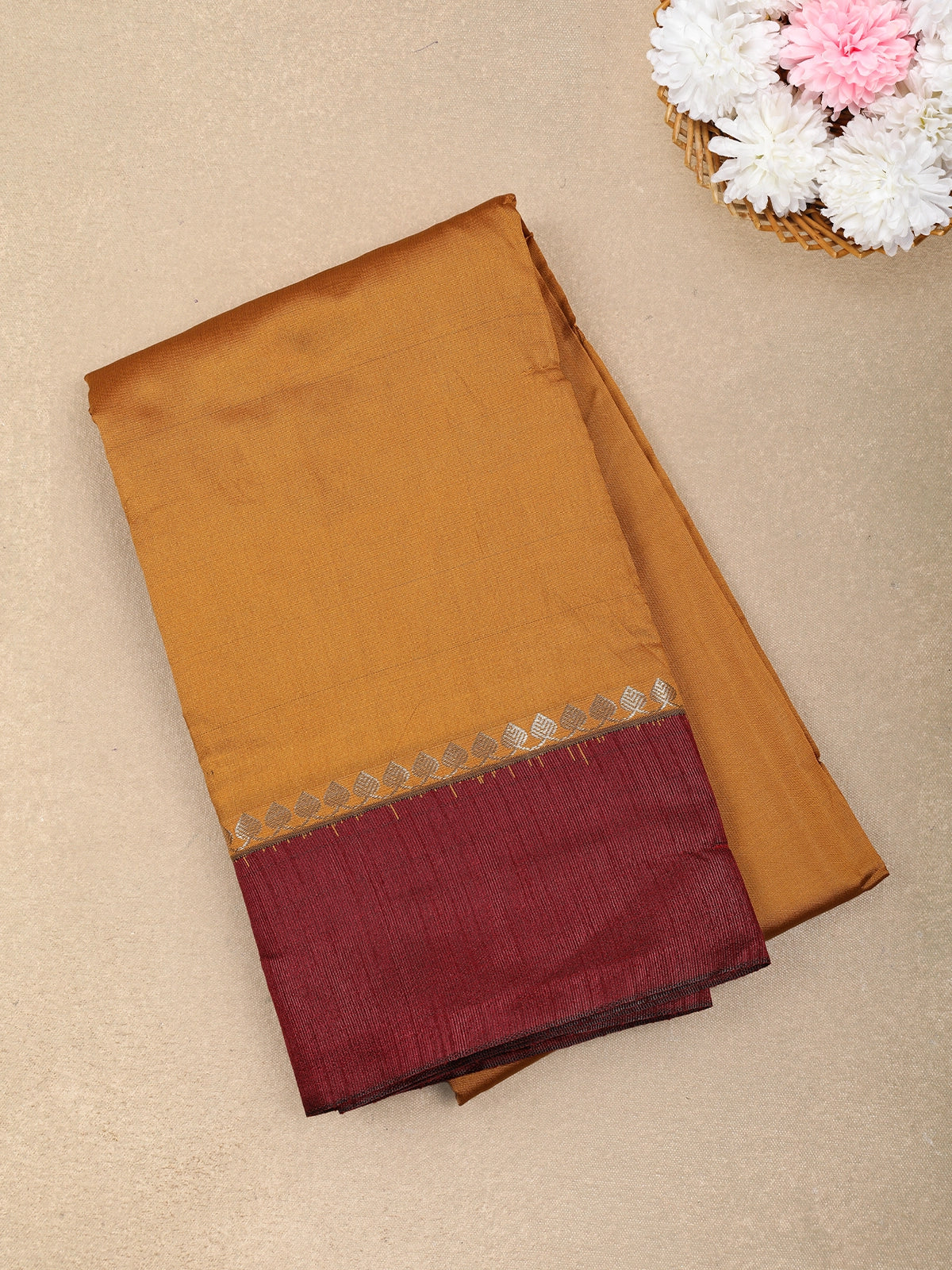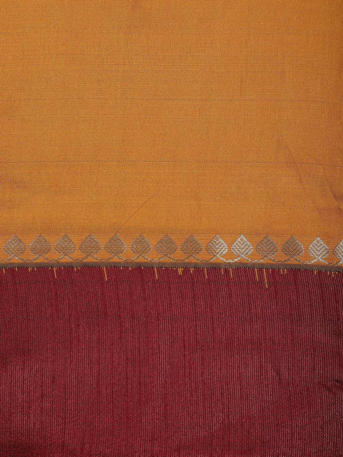The saree is accentuated with a contrasting maroon border, woven with subtle zari detailing that adds depth and traditional charm. The fine zari work along the border enhances the overall appeal without overpowering the elegant solid base, creating a perfect balance of simplicity and grandeur.