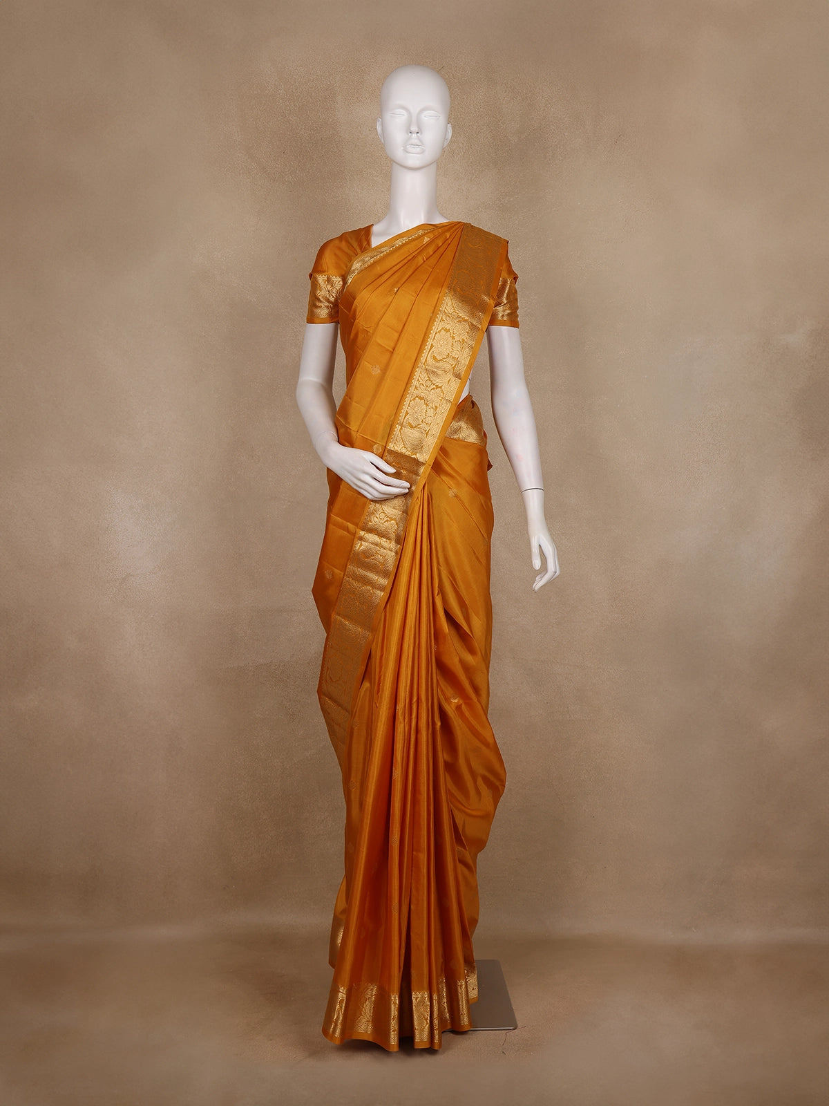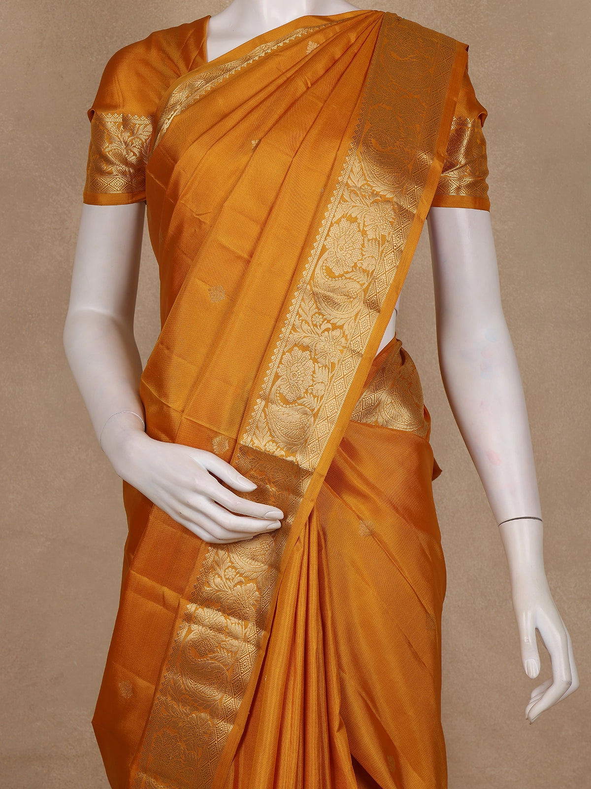 Its grandeur is elevated by the broad golden zari border and rich pallu, adorned with intricate motifs inspired by temple artistry. The lustrous texture of pure mulberry silk adds a radiant glow to the drape, making this saree a perfect pick for brides, family members of the bride & groom, and anyone who loves to dress with royal grace.