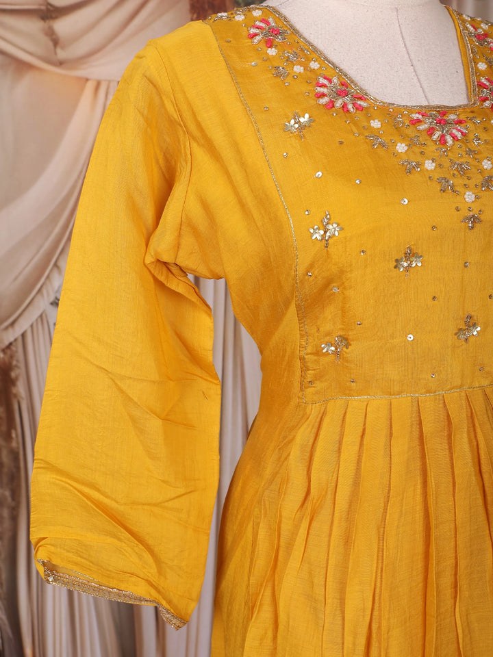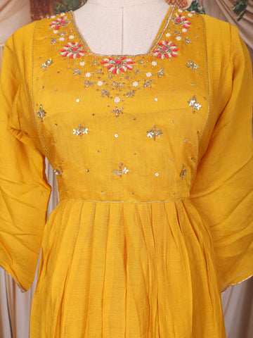 Perfect for casual festive gatherings, family celebrations, or daytime events, this mustard Anarkali captures a blend of simplicity and style. The cheerful hue paired with the intricate embroidery work makes it a versatile addition to your ethnic collection — ideal for those who appreciate lightweight grace and easy elegance.