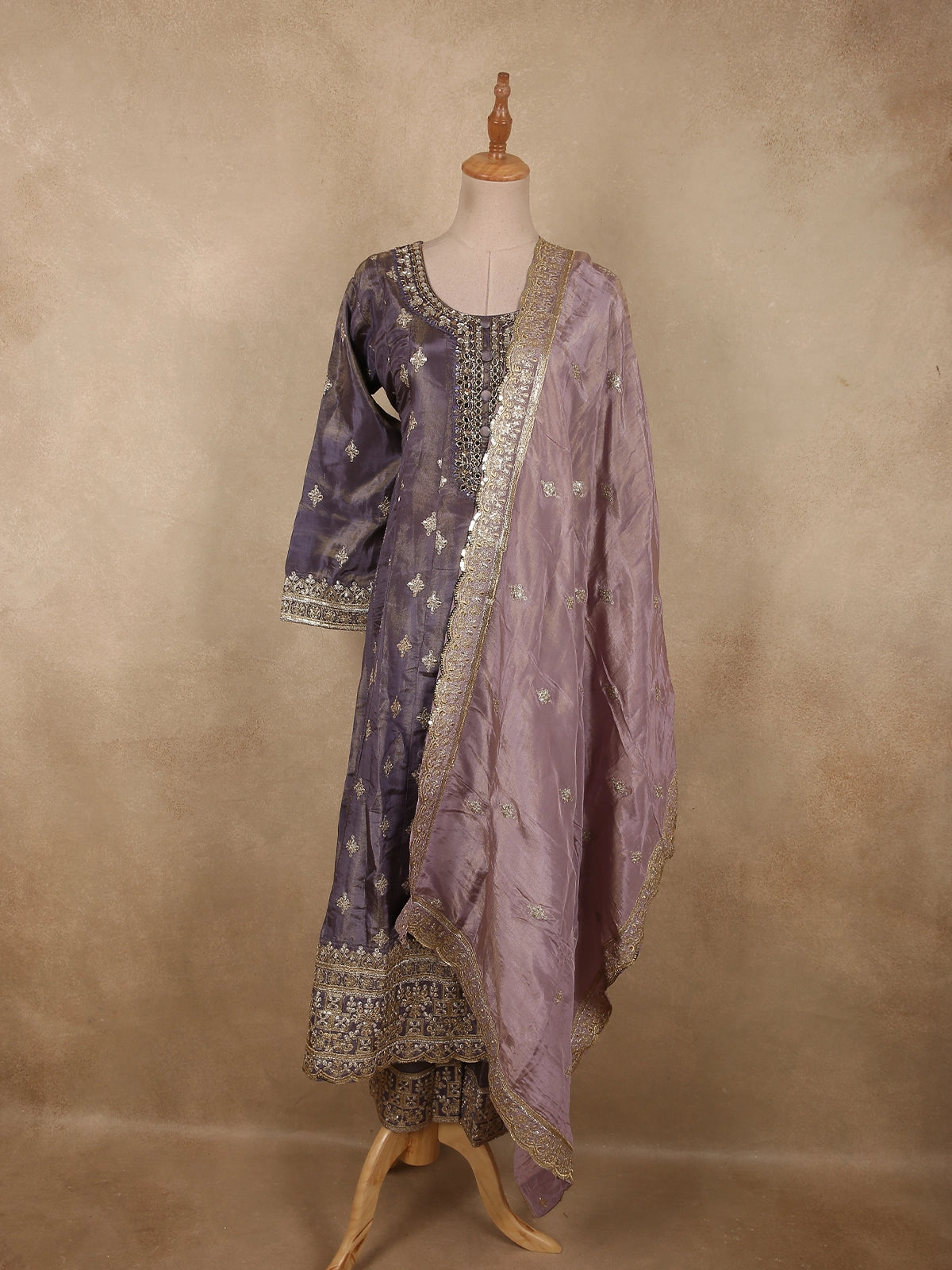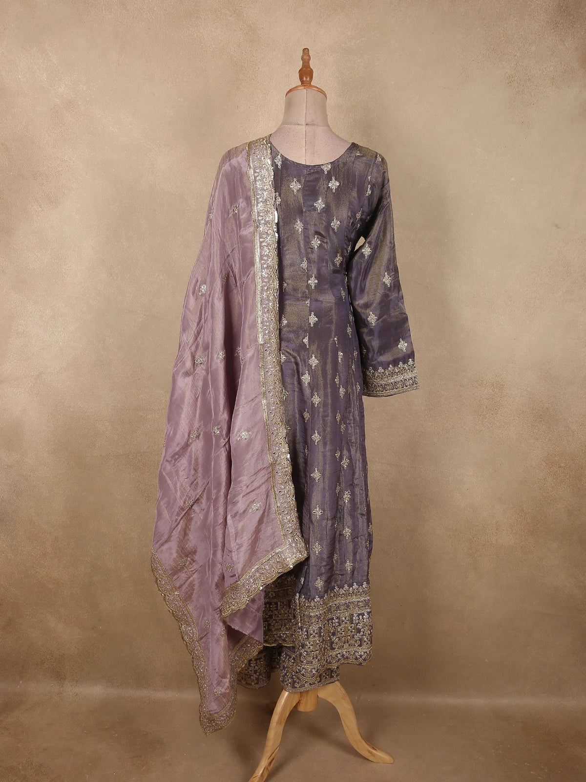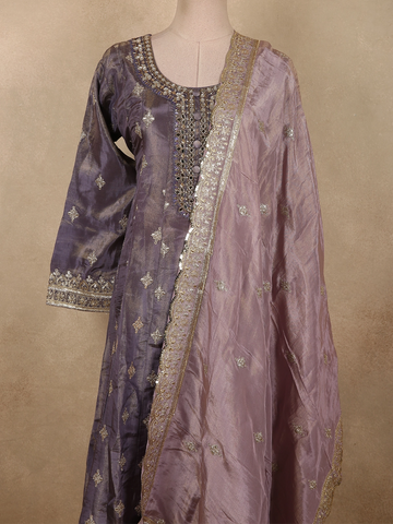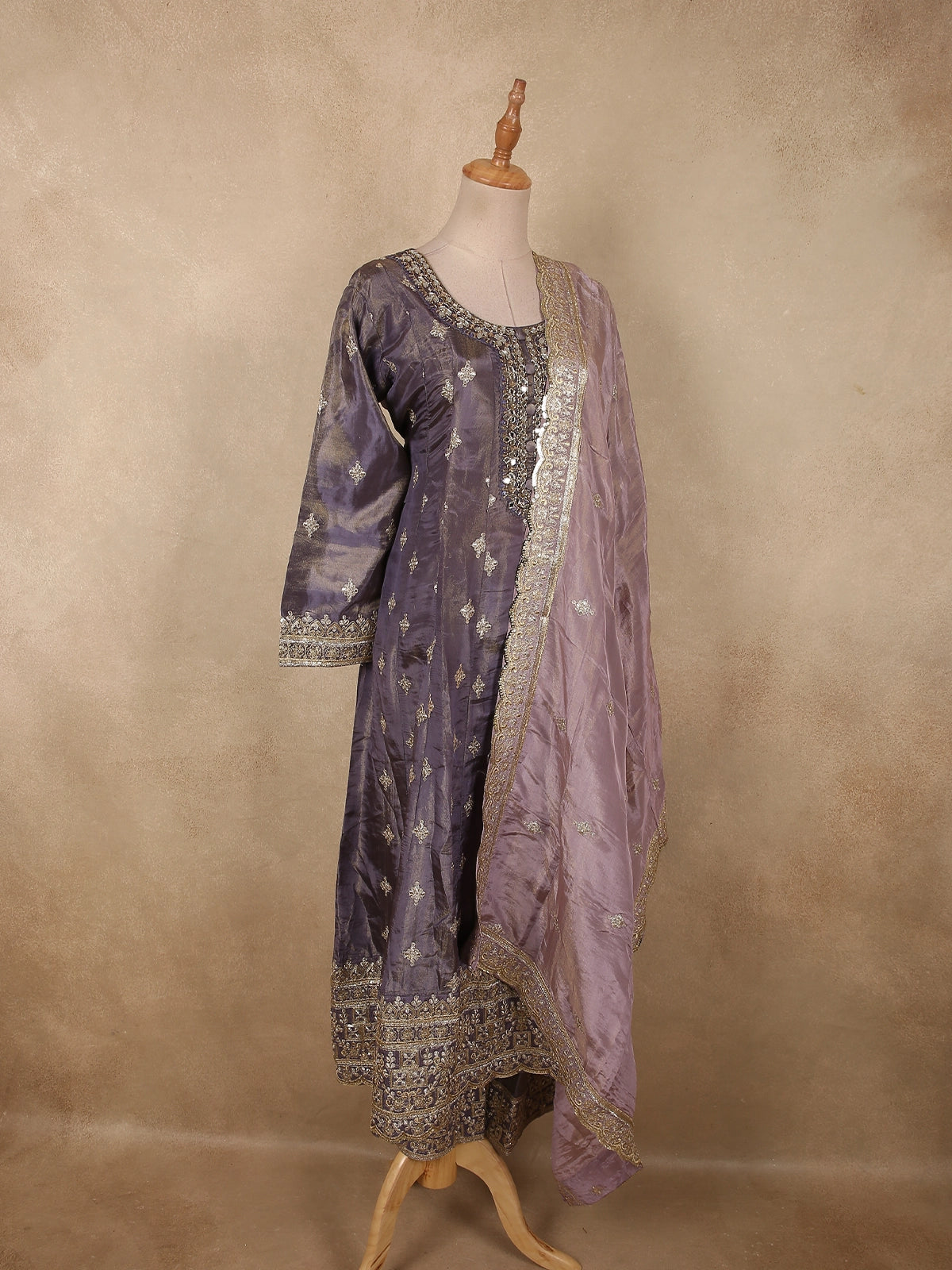 Muted Lavender Purple Floral Zari and Mirror Embroidered Design Tissue Organza Salwar Suit