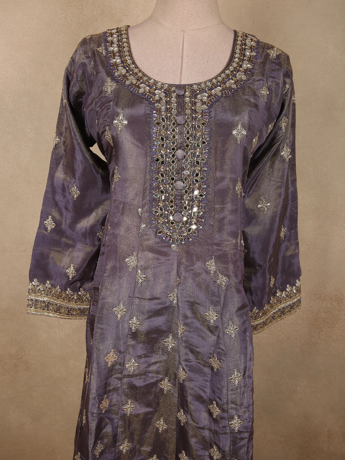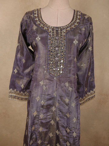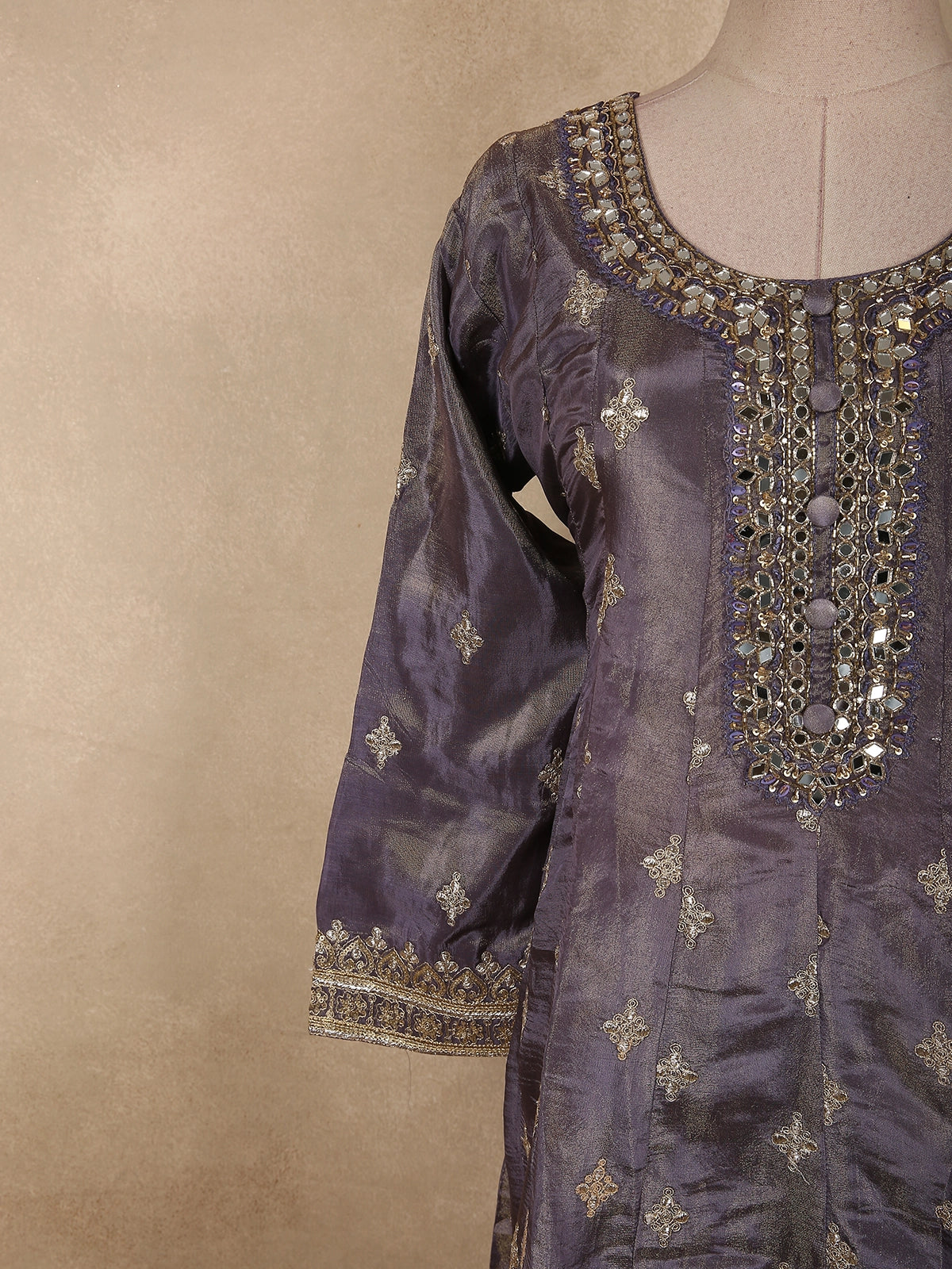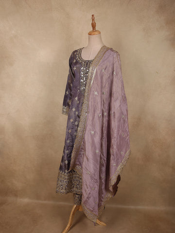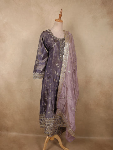 Muted Lavender Purple Floral Zari and Mirror Embroidered Design Tissue Organza Salwar Suit