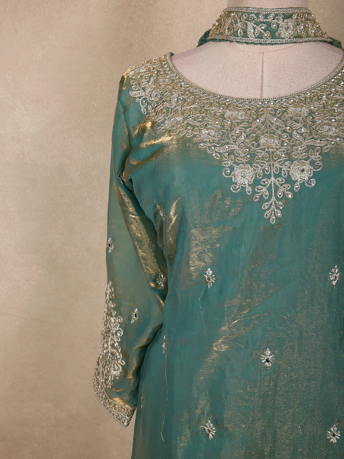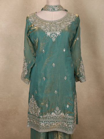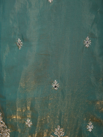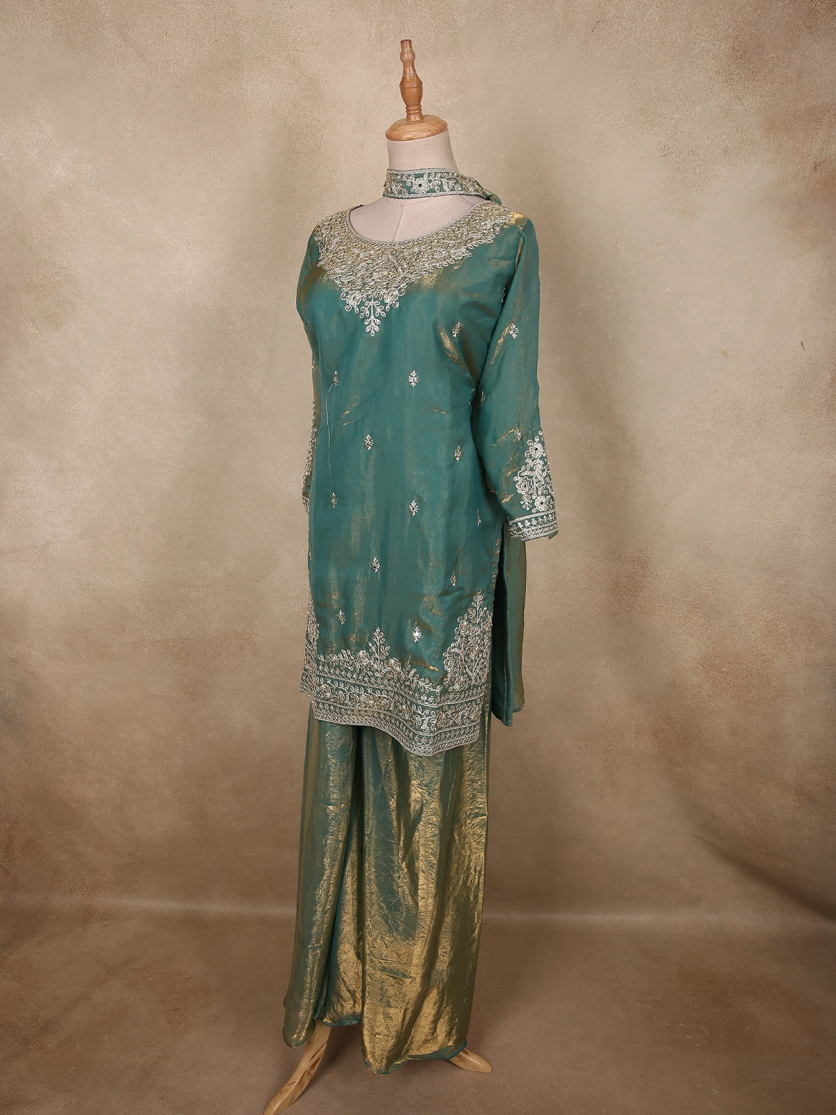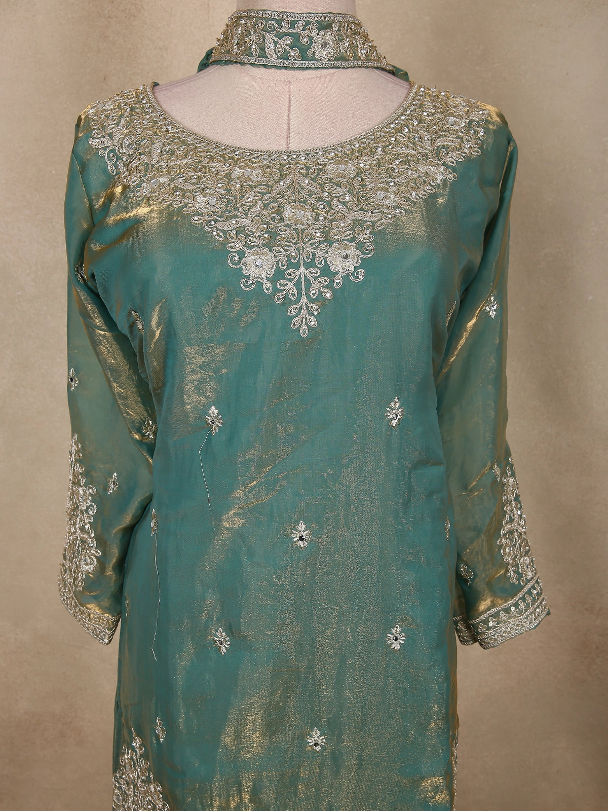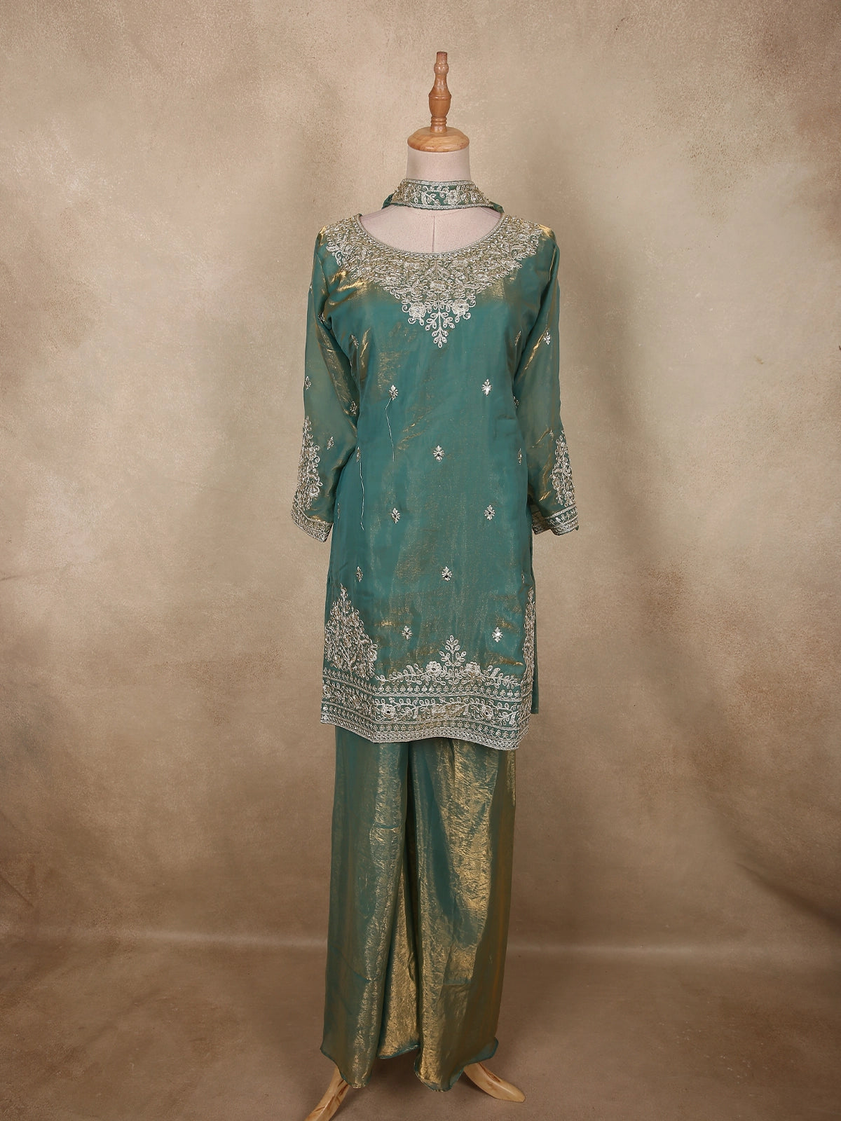 Muted Sage Olive Green Floral Zari Embroidered Design Organza Palazzo Suit with Dupatta