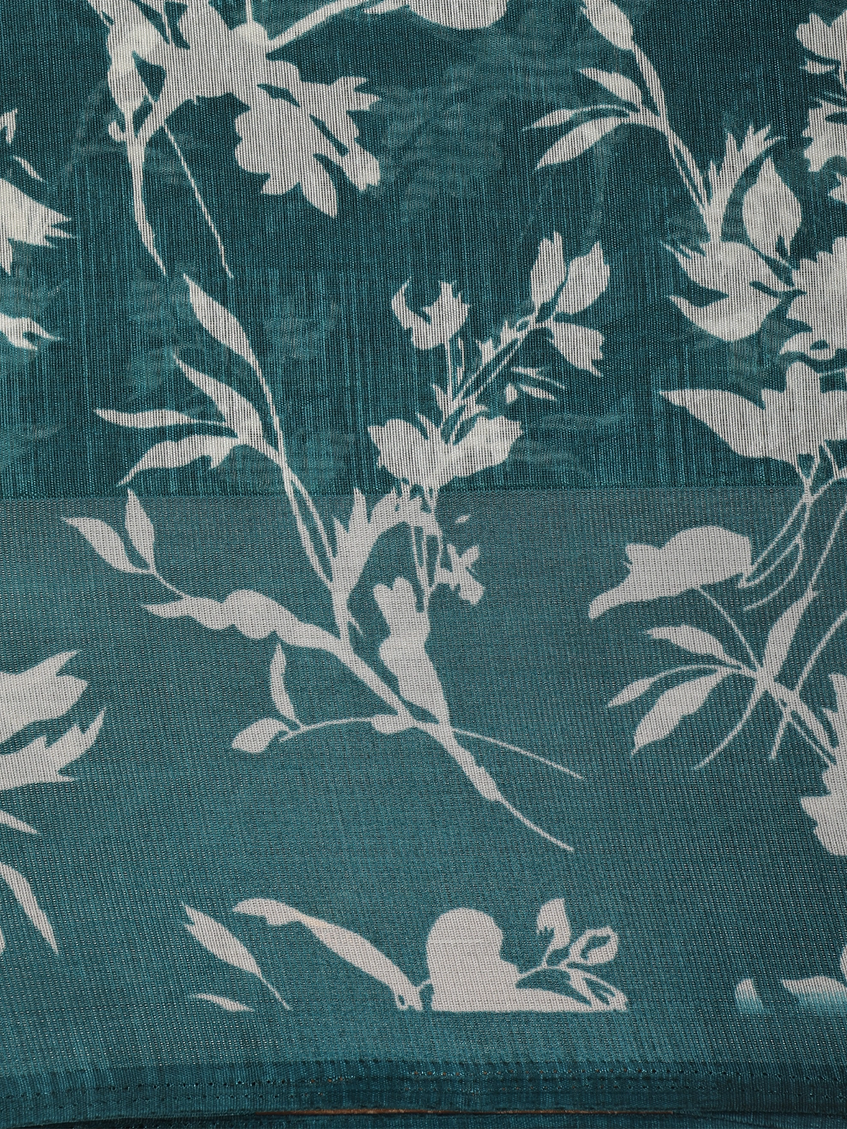 Muted Teal Green Leaf Printed Design Mixed Cotton Saree