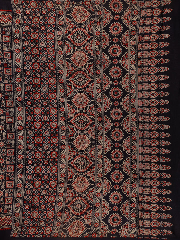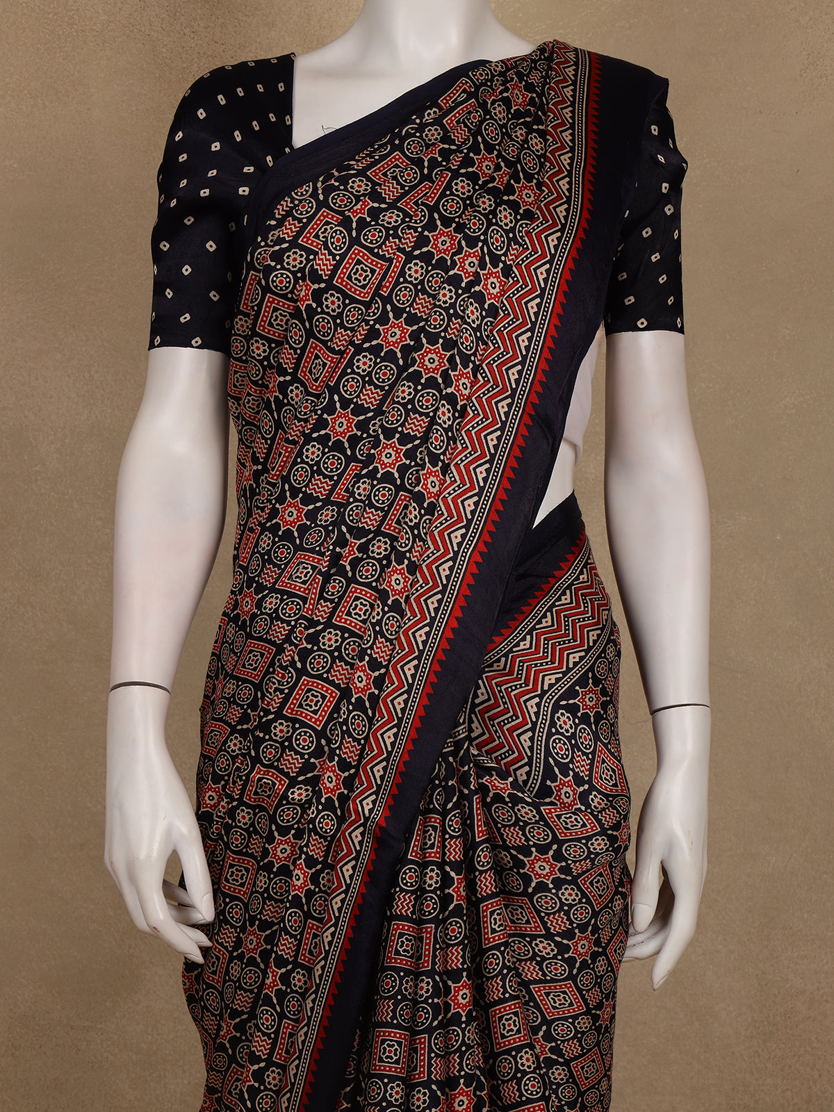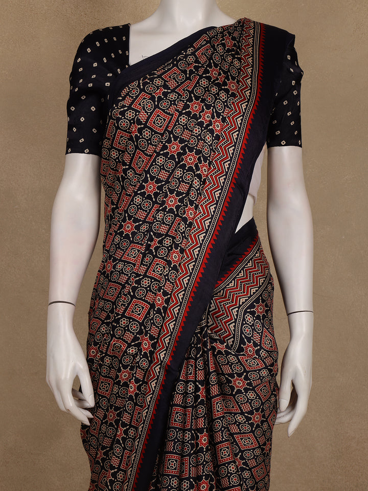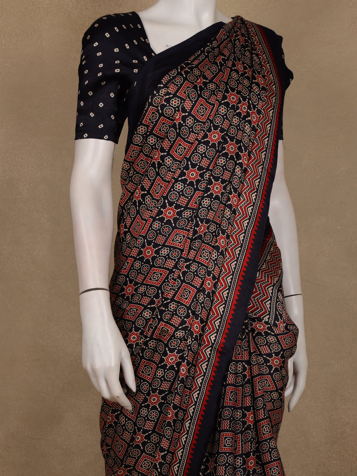 Navy Blue Ajrakh Print Mul Mul Cotton Saree