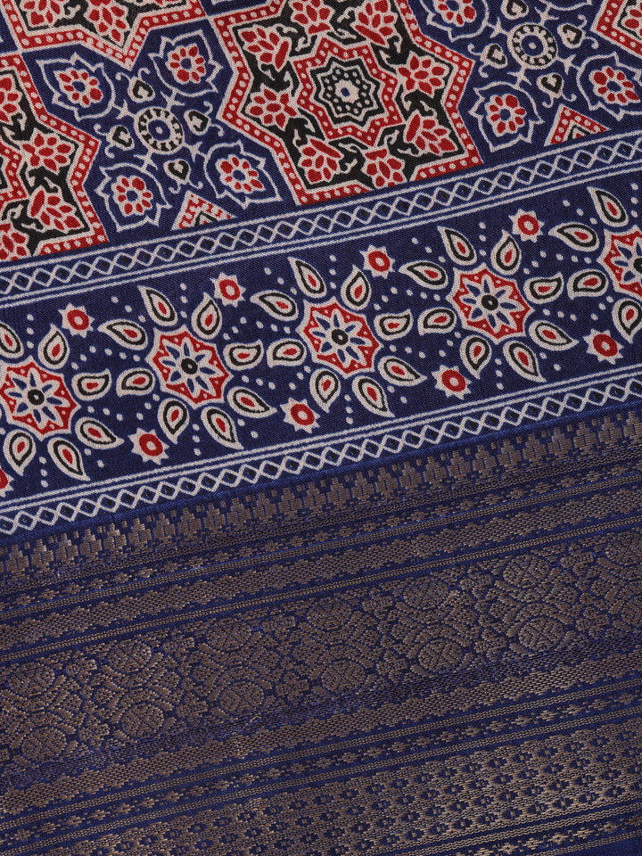 Navy Blue Ajrakh Printed Cotton Saree with Zari Border