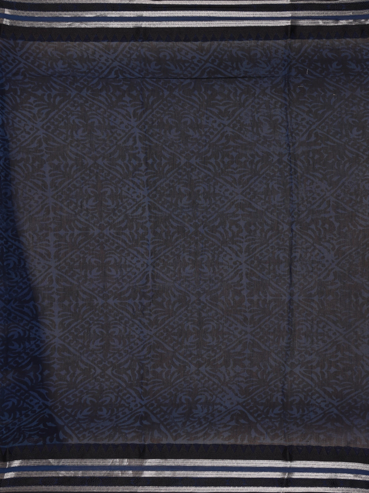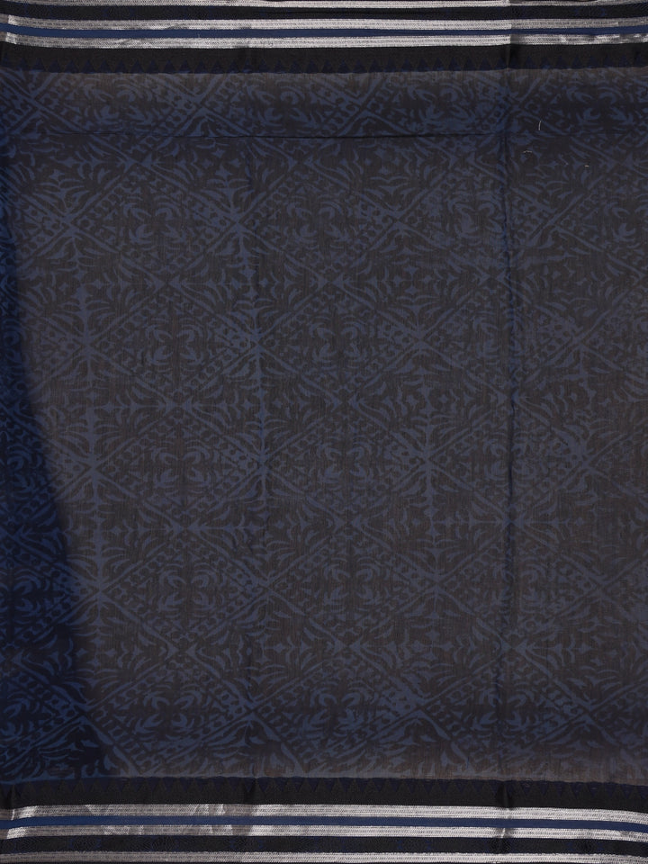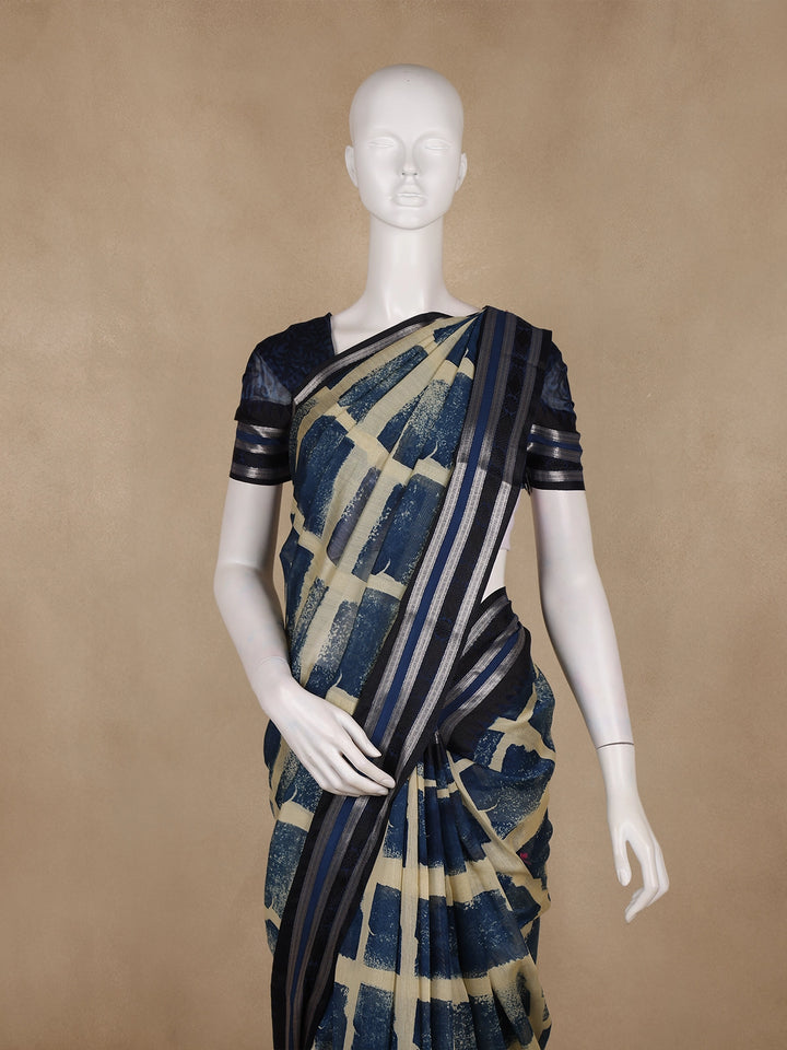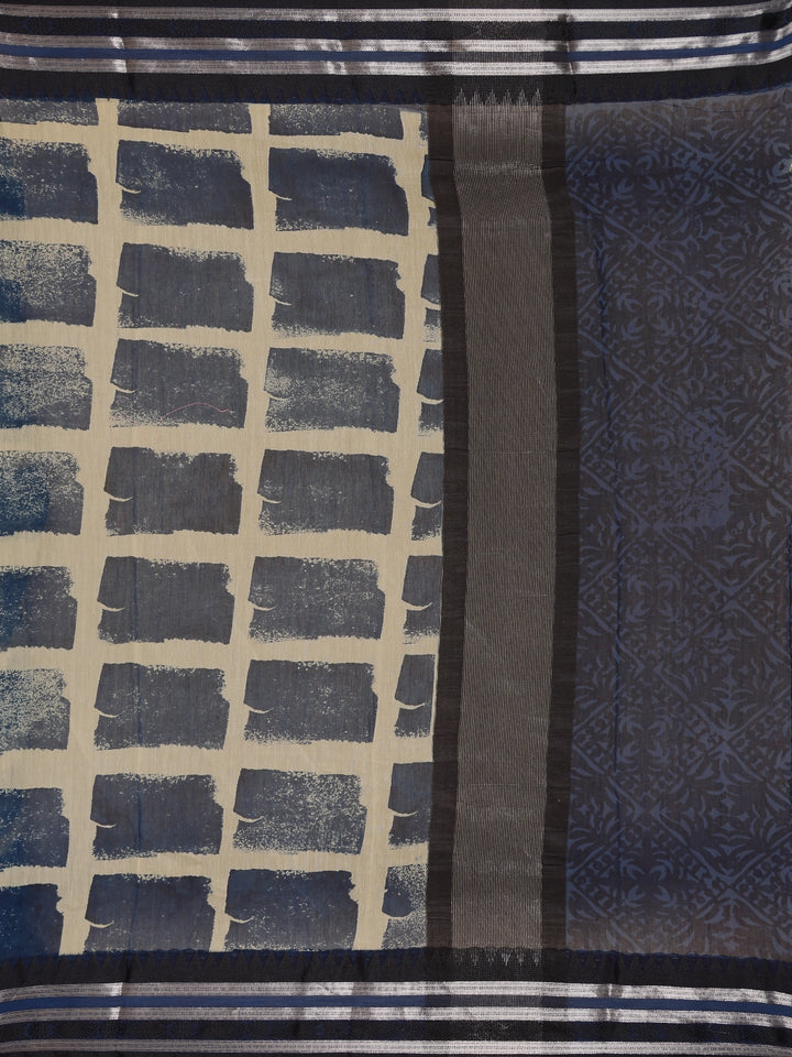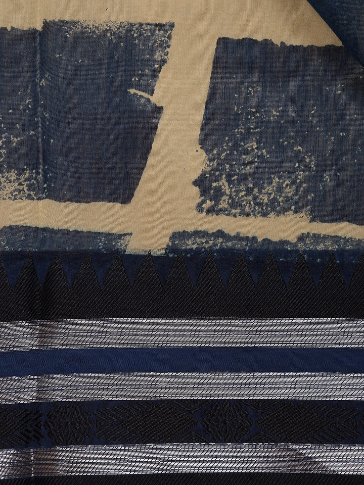 Navy Blue And Beige Abstract Brush Print Chandheri Cotton Saree