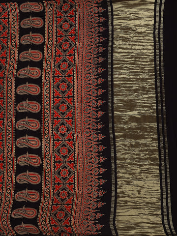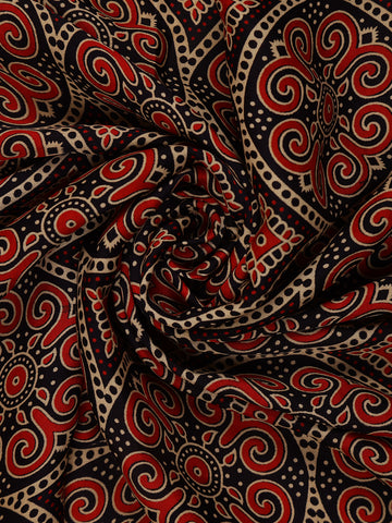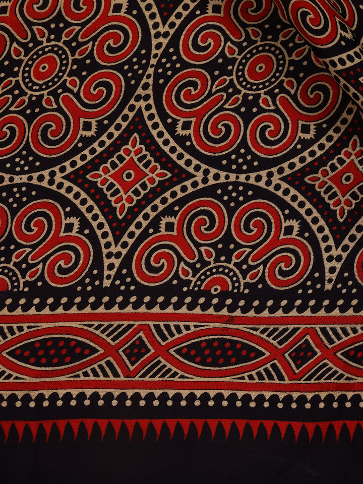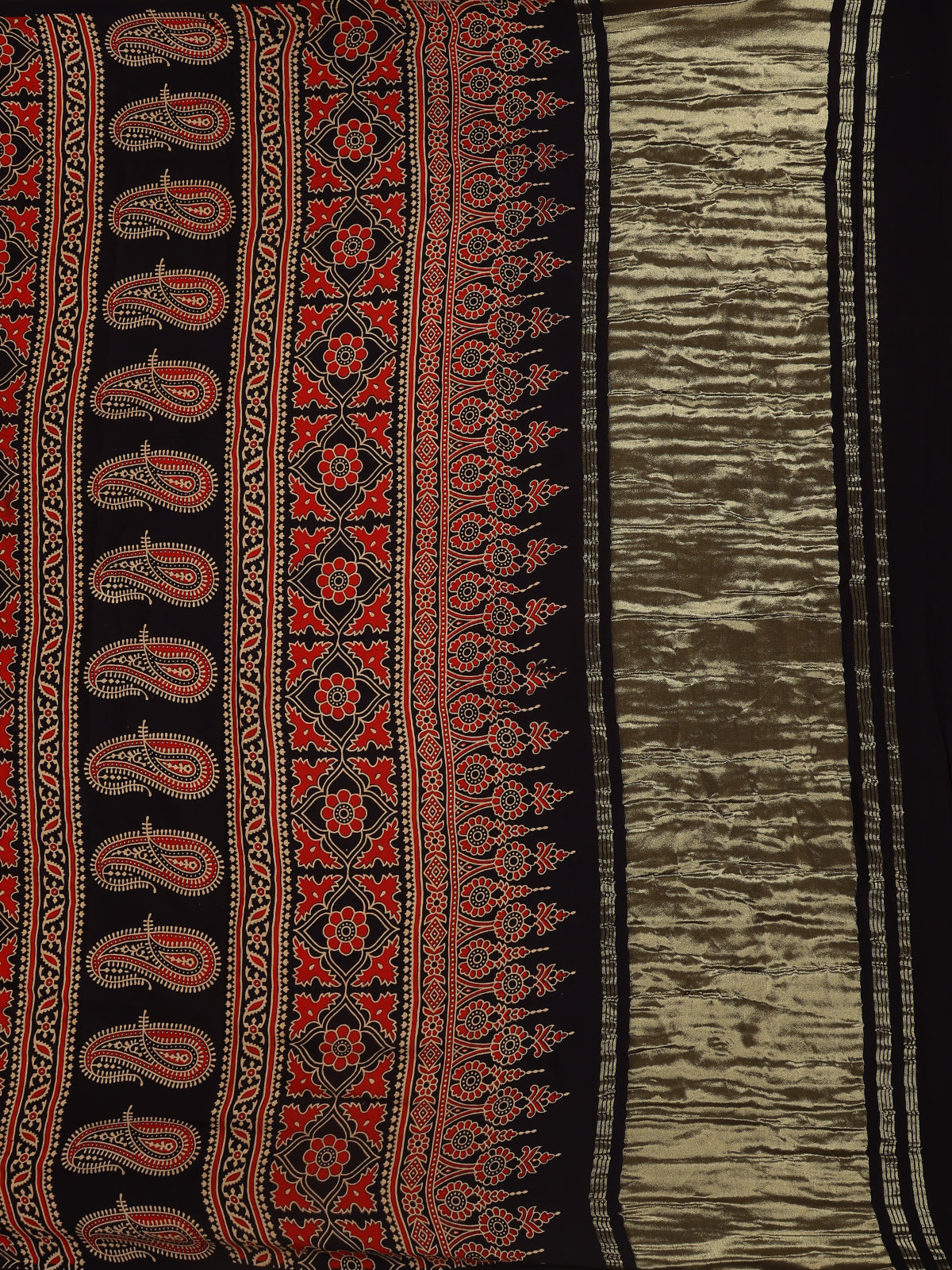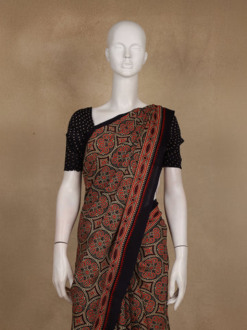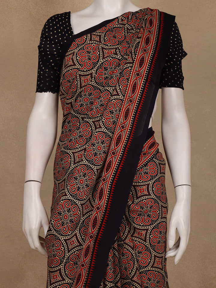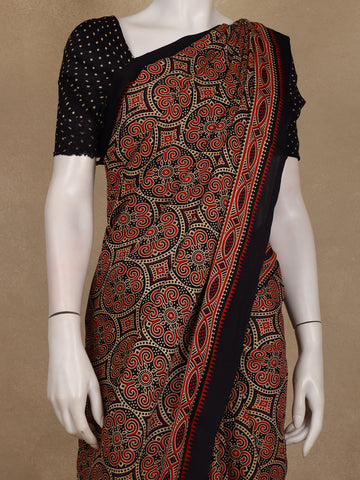Navy Blue and Red Ajrakh Print Mul Mul Cotton Saree