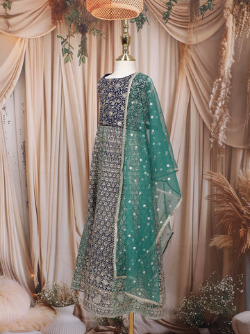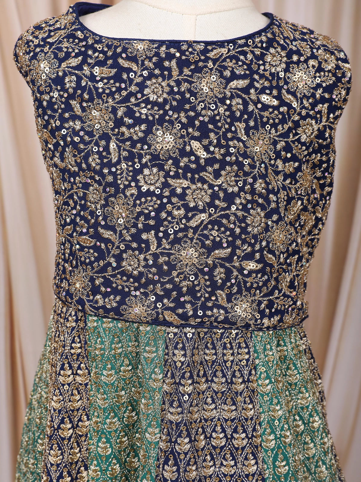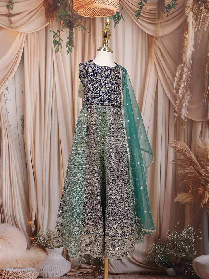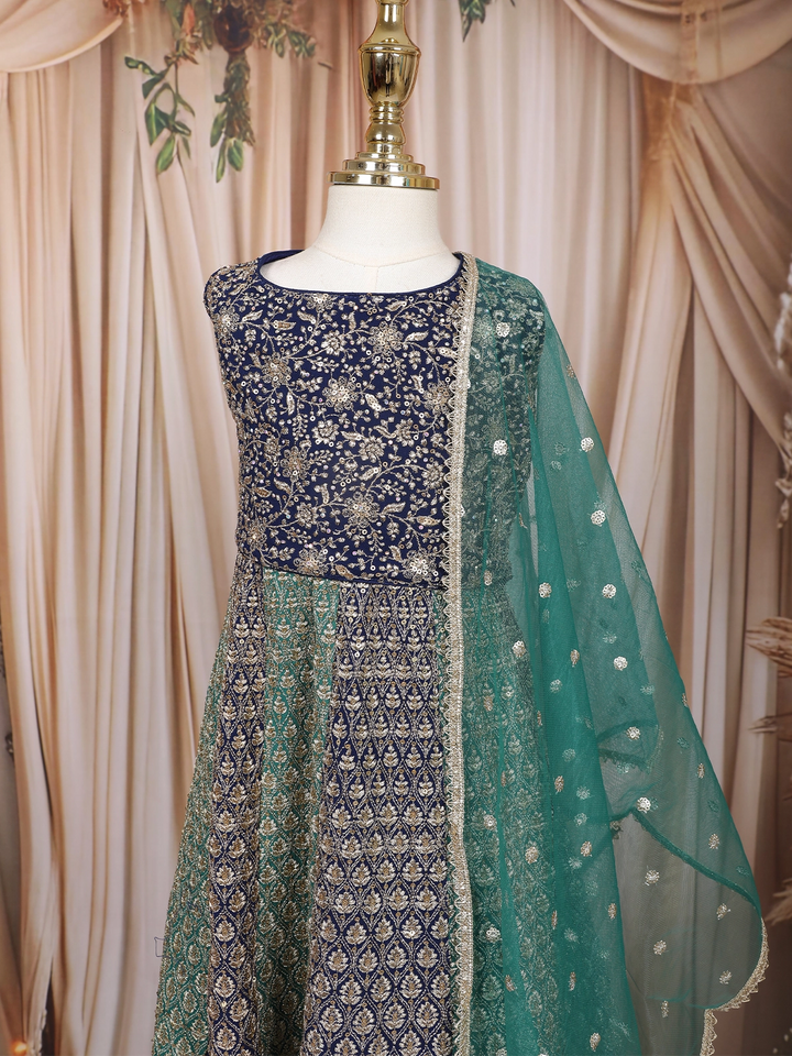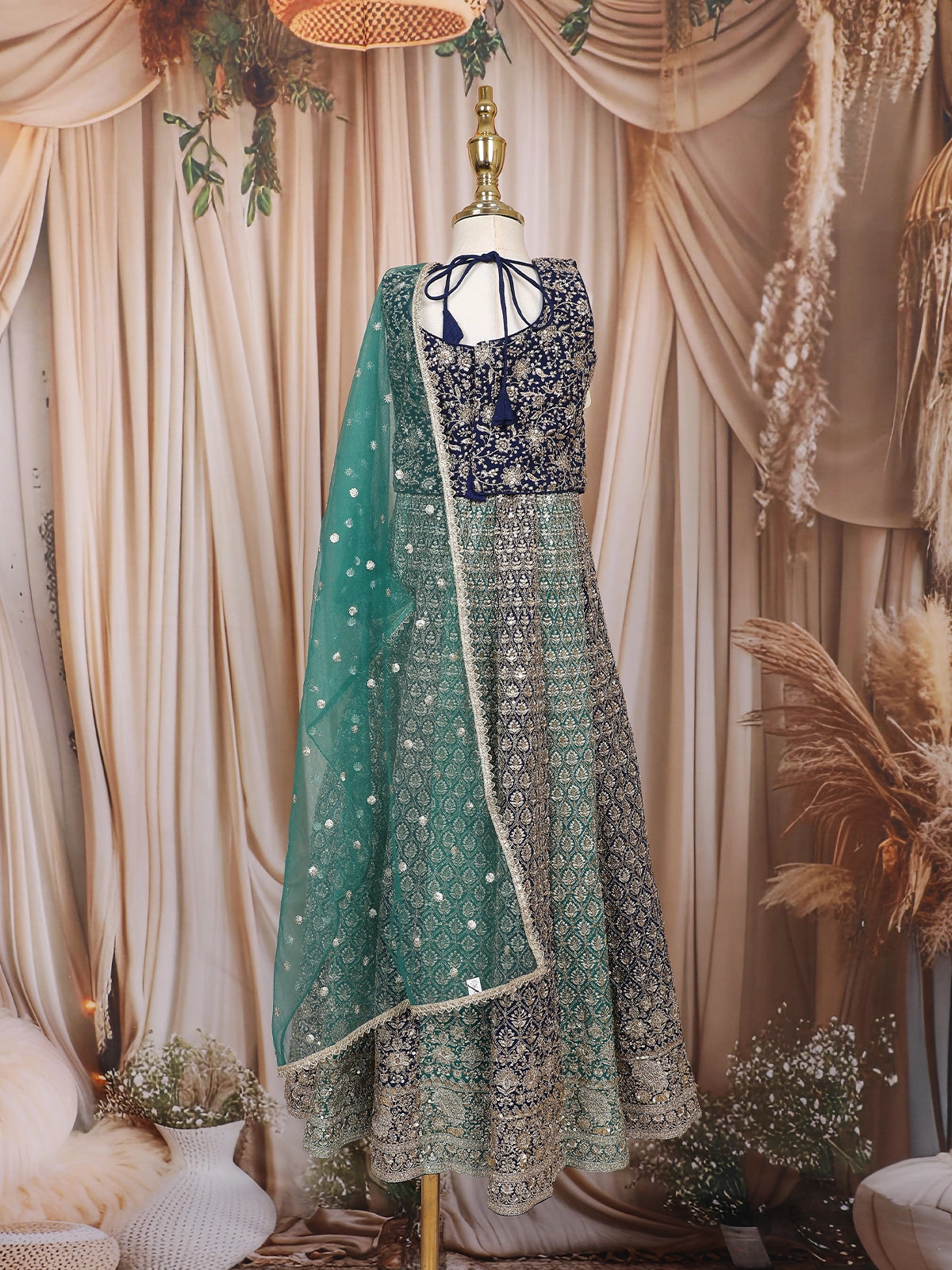 Navy Blue and Sea Green Floral Embroidered Design Georgette Kids Lehenga with Net Dupatta