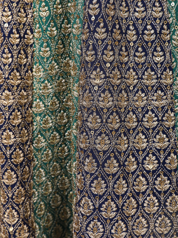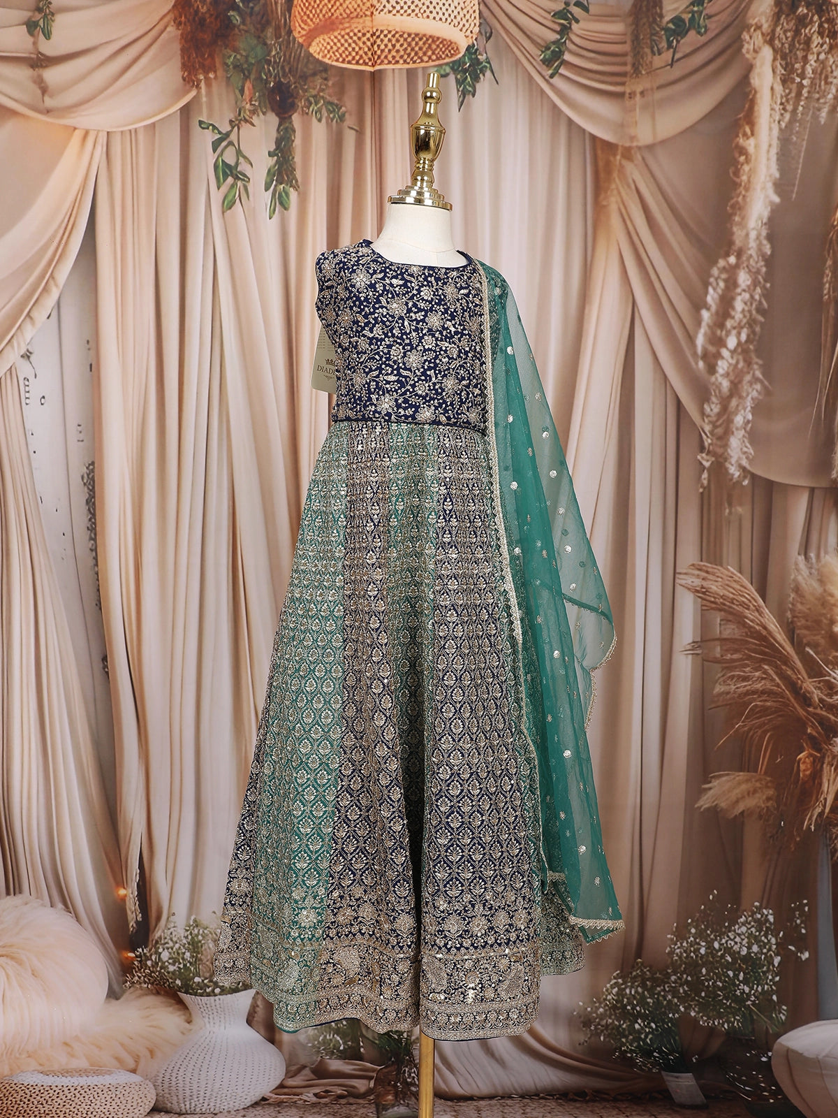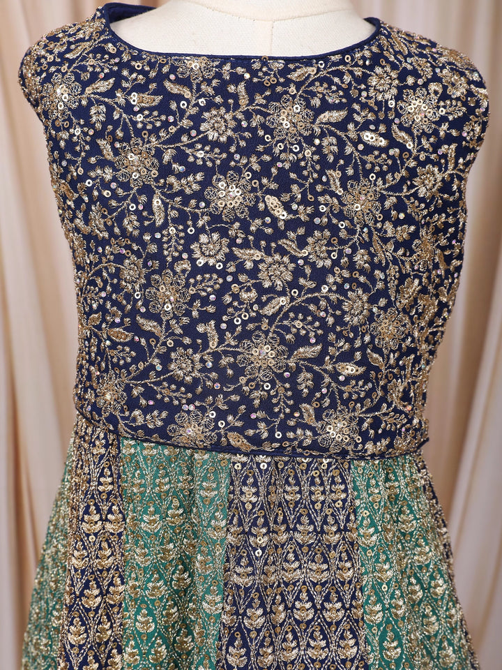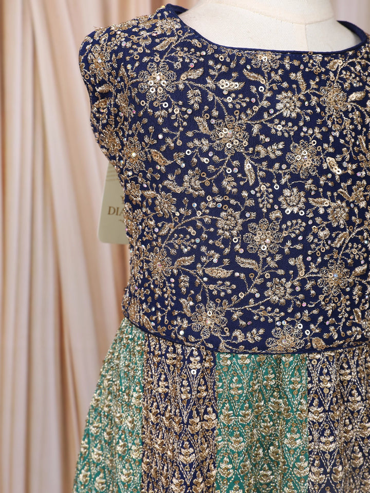 Make your little one sparkle in this regal Navy Blue and Sea Green Georgette Kids Lehenga, designed to bring elegance and joy to festive celebrations. The lehenga features intricate floral embroidery done with zari and sequin work, creating a beautiful interplay of shimmer and grace. The rich navy blue blouse pairs perfectly with the sea-green flared lehenga, highlighted with ornate embroidered borders that add a luxurious touch.