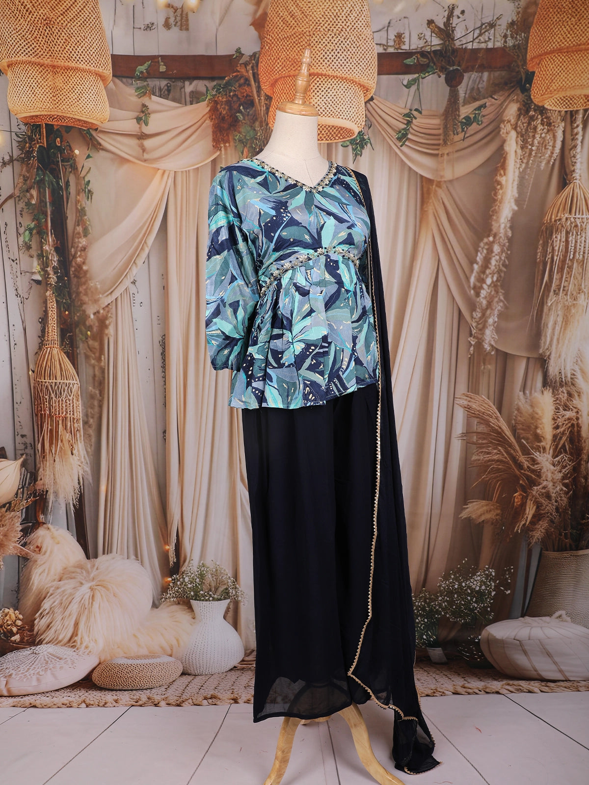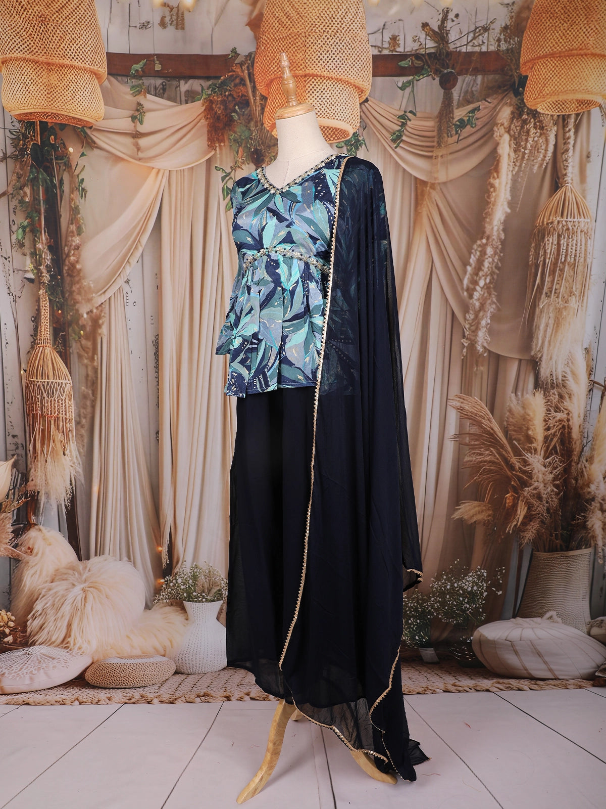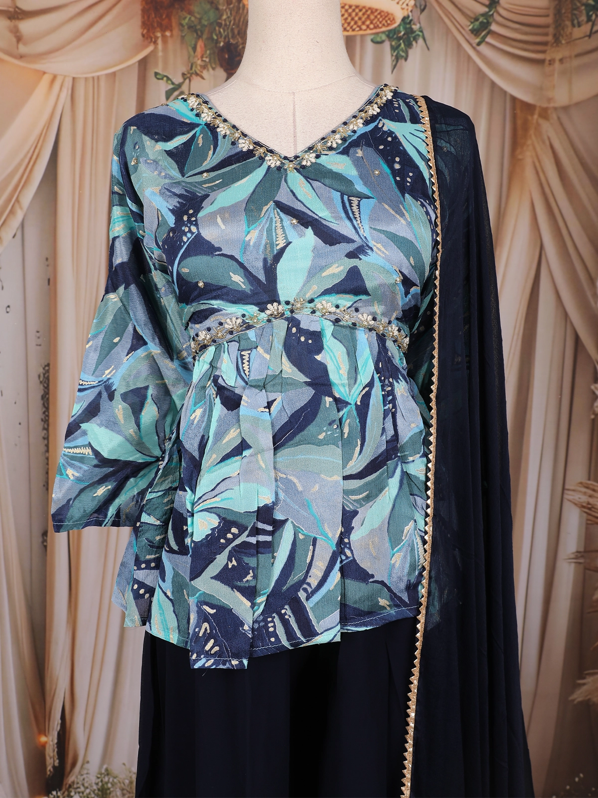 The peplum-style top features an eye-catching abstract leaf print in soothing teal, aqua, and navy shades, enhanced with mirror and lace embellishments around the neckline and waist for a touch of sparkle. The V-neckline and flared 3/4 sleeves bring a graceful flow to the silhouette, while the solid navy palazzo pants add balance and elegance. Completing the look is a matching chiffon dupatta with a gold lace border, lending a refined finish to the outfit.