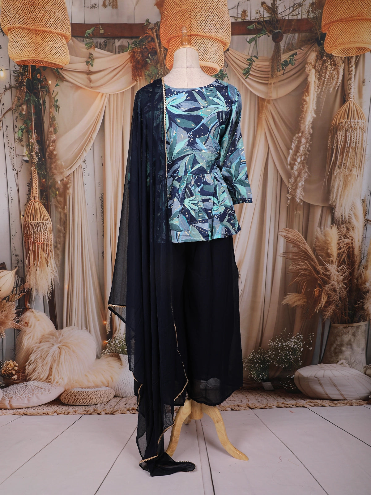 Navy Blue and Teal Abstract Printed Design Peplum Top Palazzo Suit with Dupatta